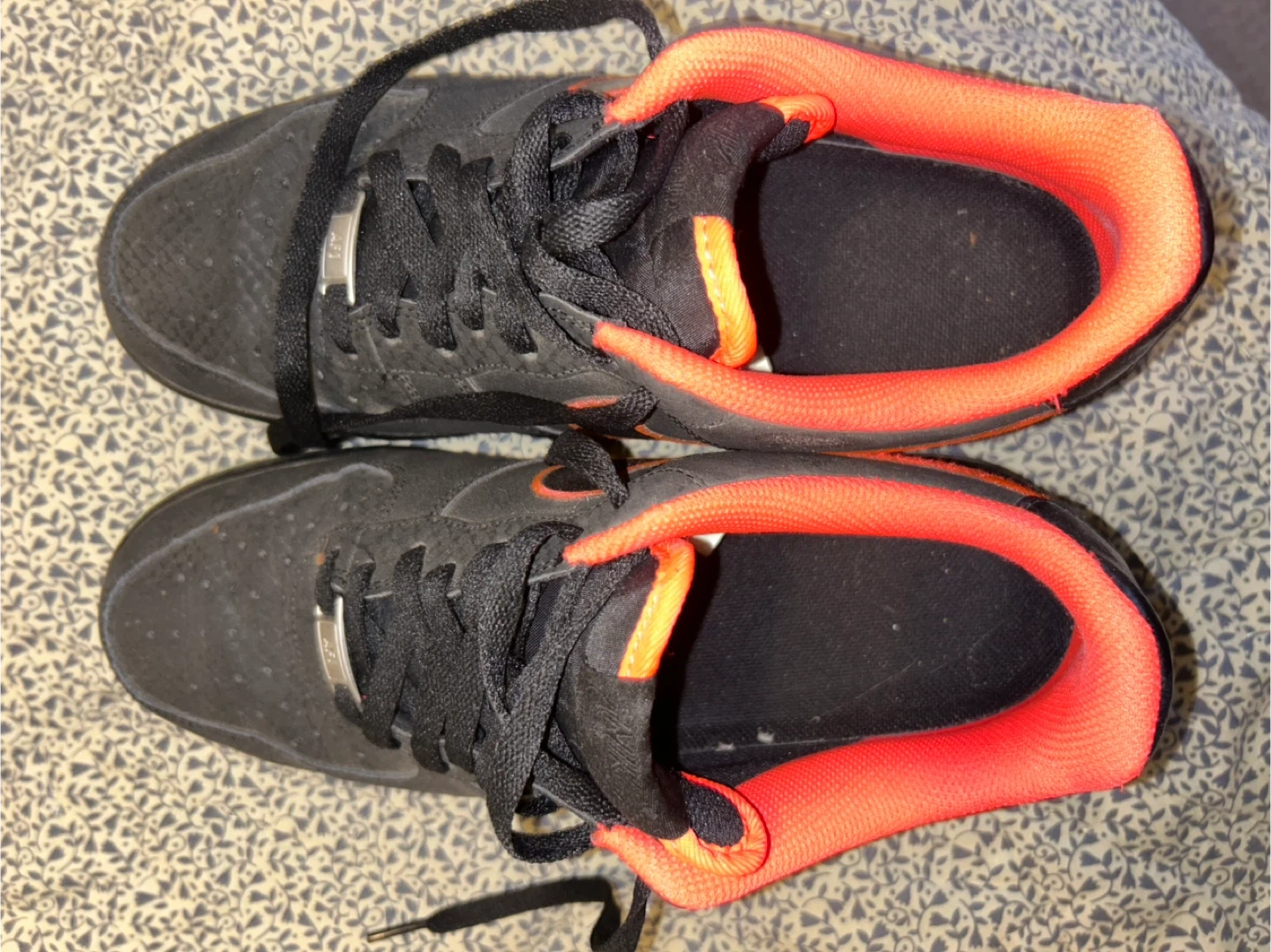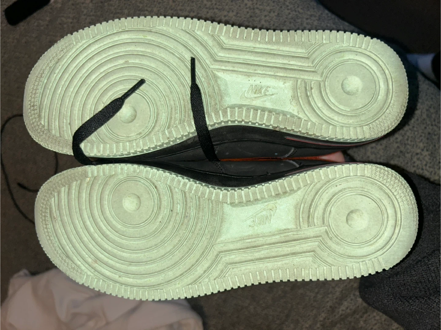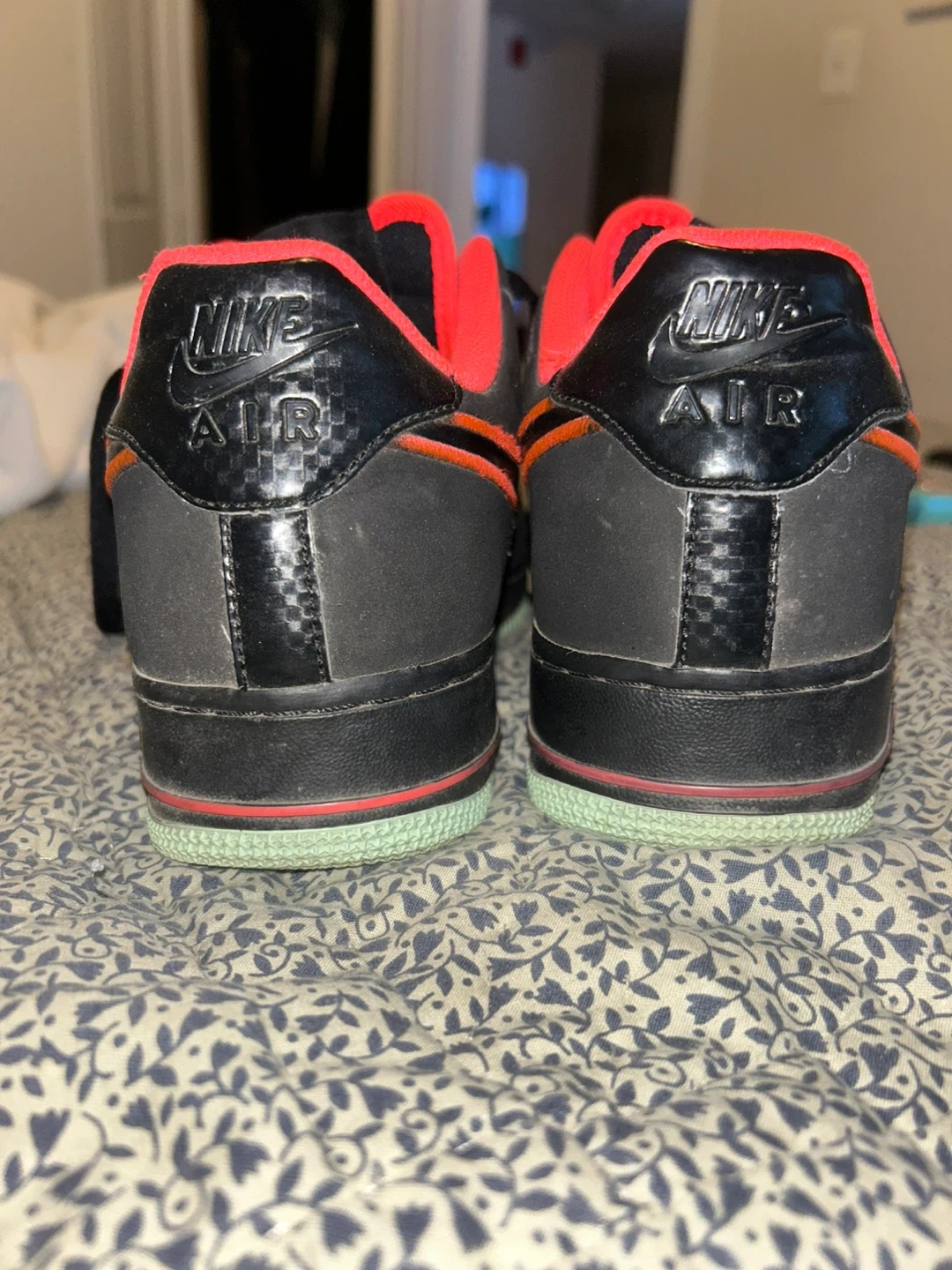 These are black Nike Air Force 1 sneakers with red accents. They feature a synthetic and carbon fiber material mix. The soles are light green rubber.