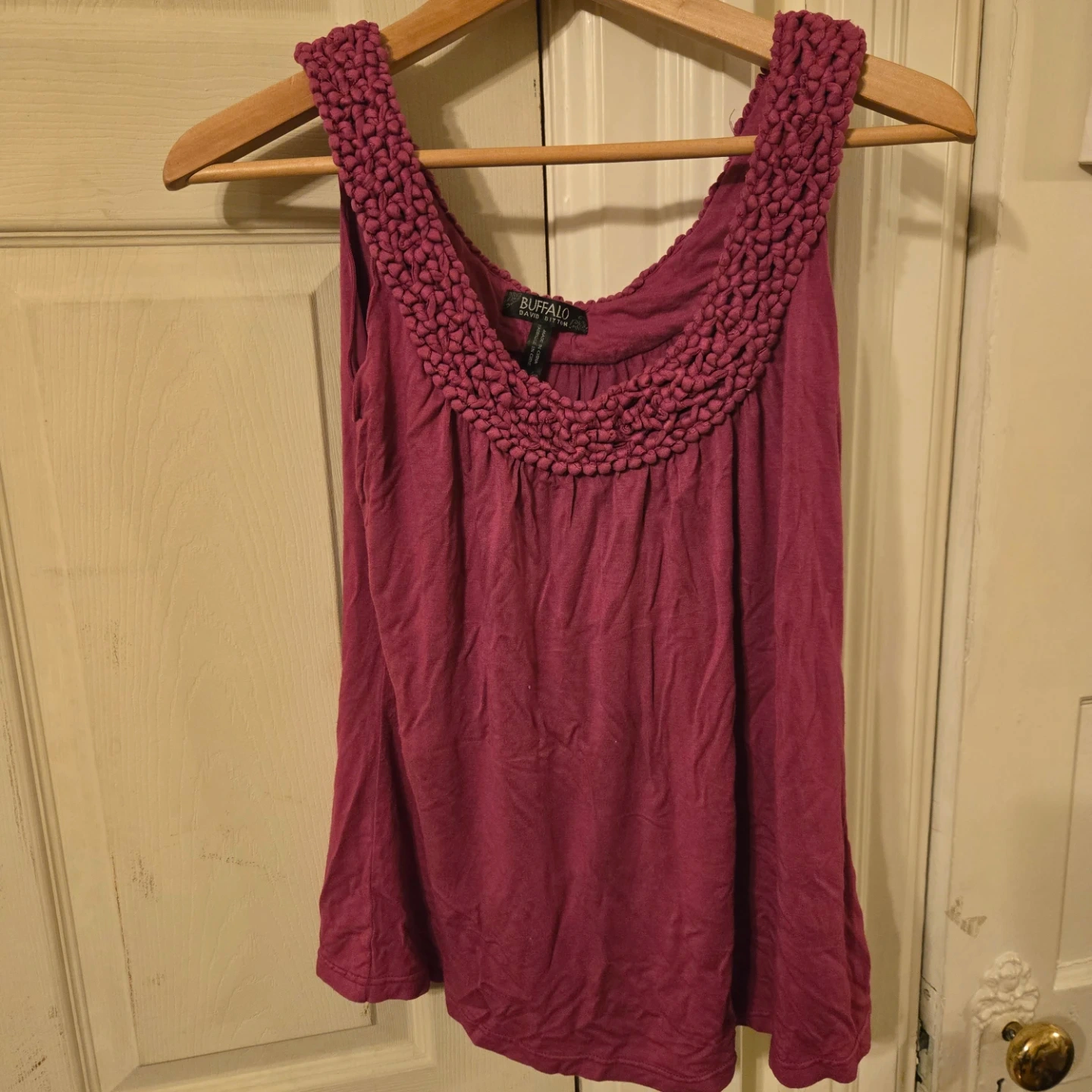 This is a magenta Buffalo David Bitton tank top with a unique braided neckline detail. It's made from 95% rayon and 5% spandex.