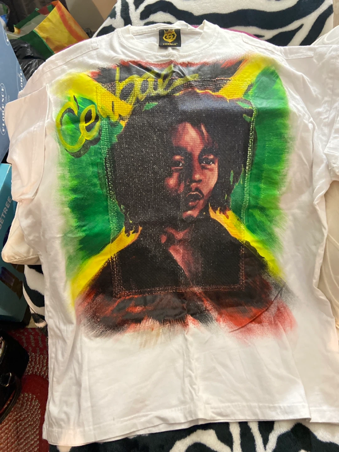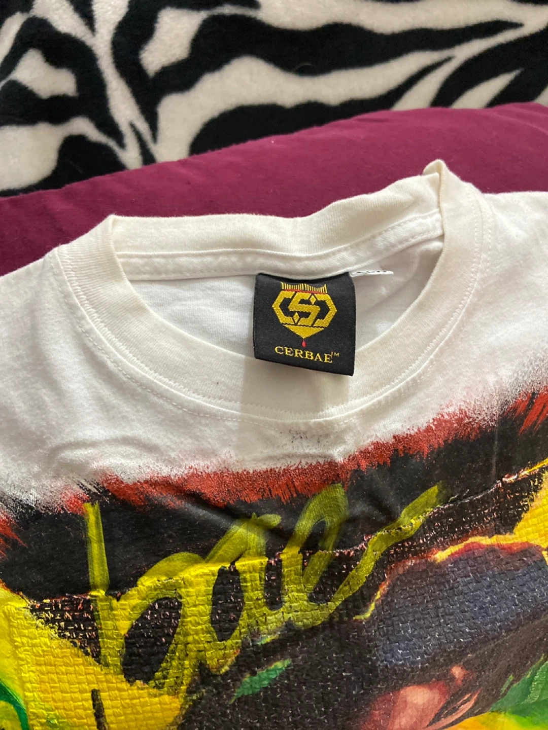 White CERBAE t-shirt featuring a graphic print of Bob Marley. 100% cotton material. Great for fans!