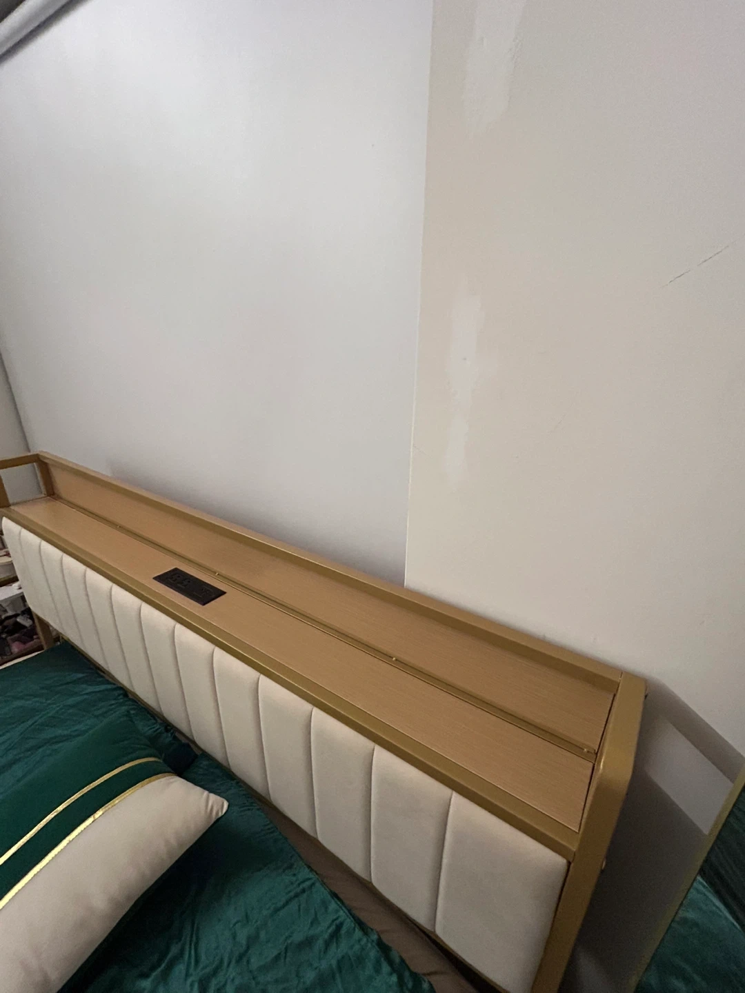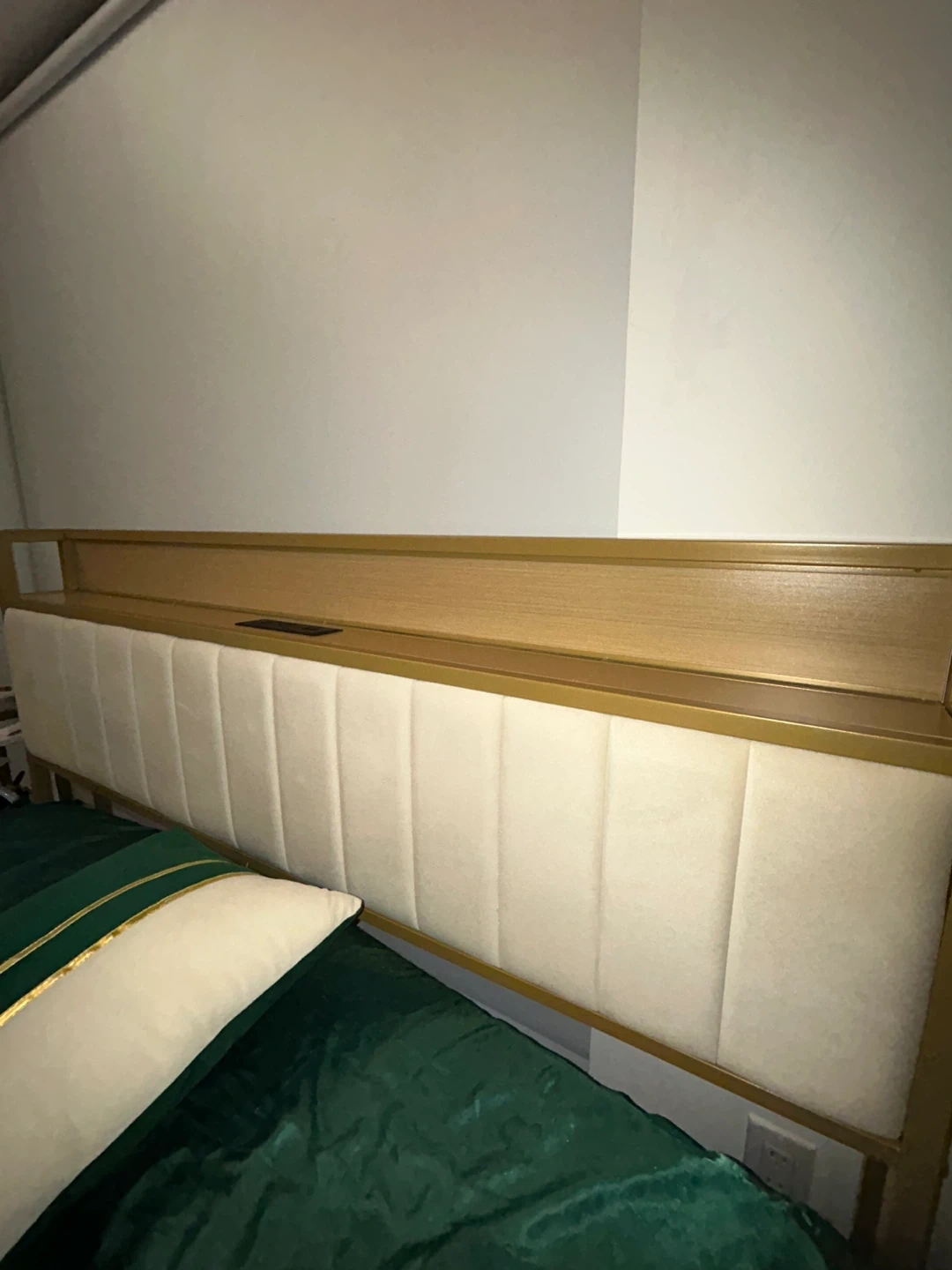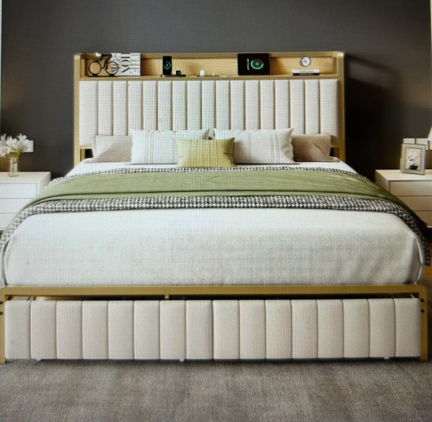 This bed frame features a cream upholstered headboard with integrated shelving and charging ports. Its sturdy gold metal frame offers modern style. It's a platform bed, so no box spring is needed. This bed is great for smaller rooms or anyone who likes to keep essentials nearby.