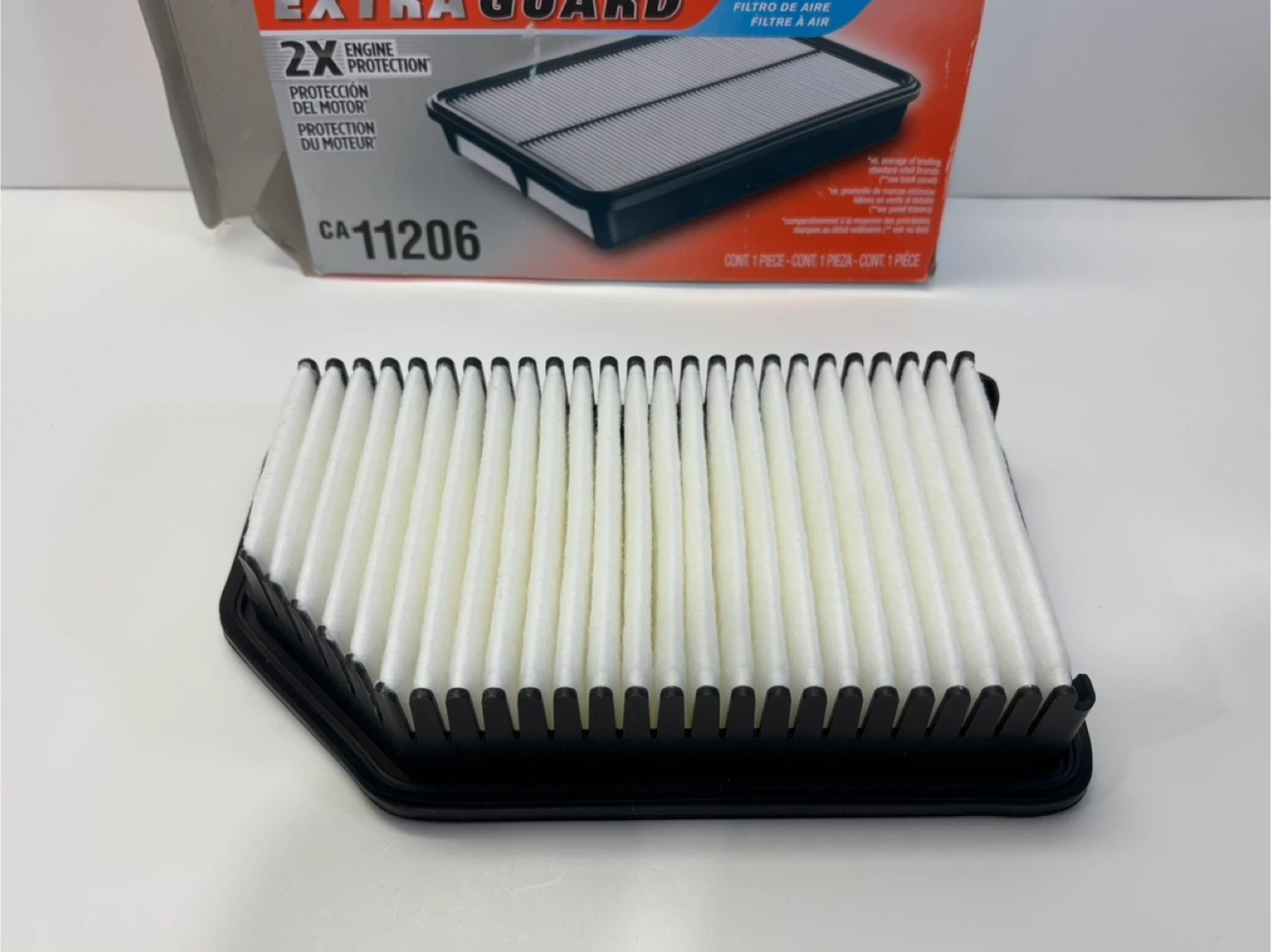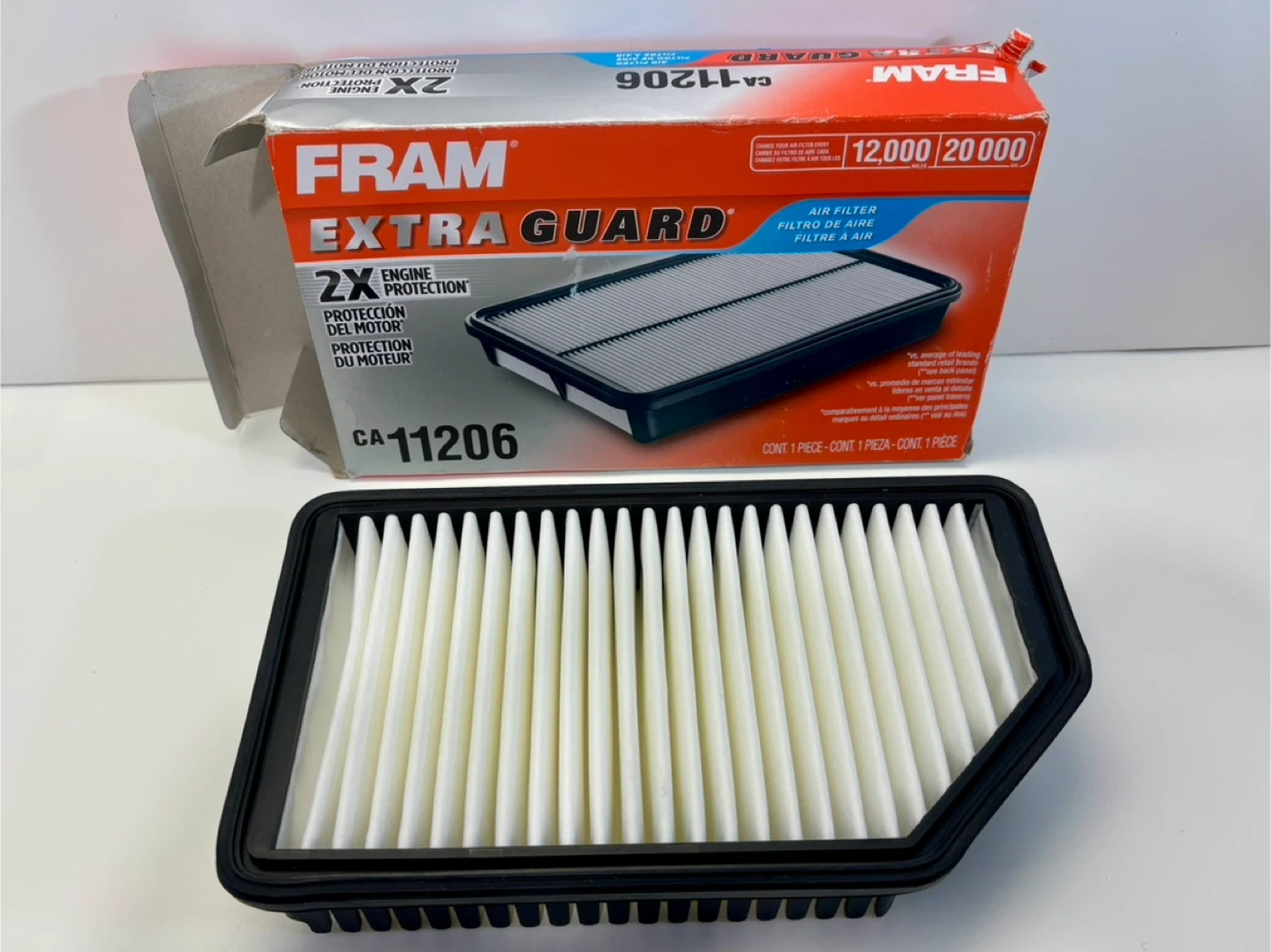 FRAM Extra Guard air filter, model CA11206. It offers 2X engine protection and installs in 5 minutes. This filter is designed for enhanced horsepower and acceleration. One piece included.