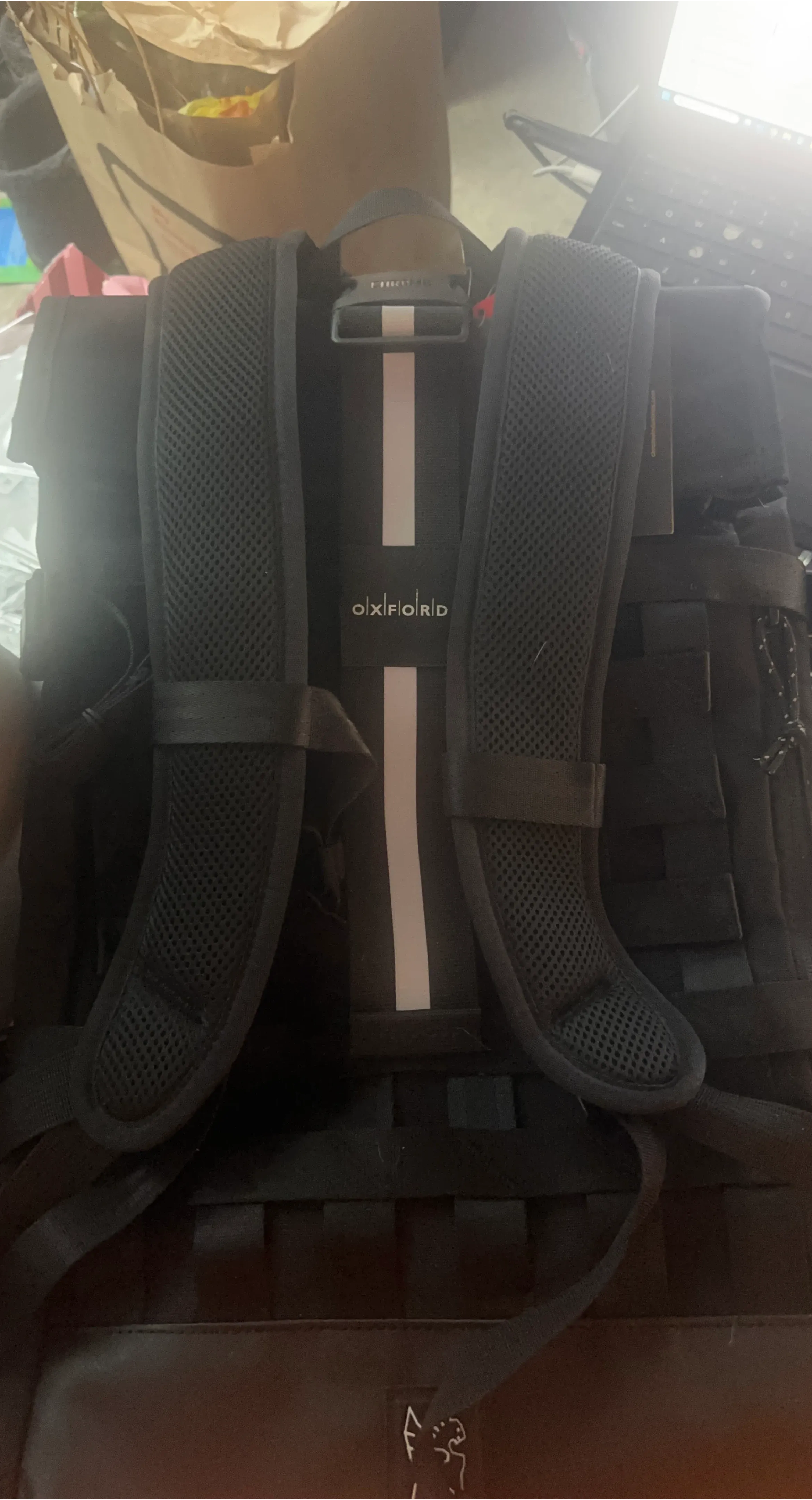Black Oxford backpack with padded shoulder straps. It has a reflective stripe for visibility. Made with durable material.