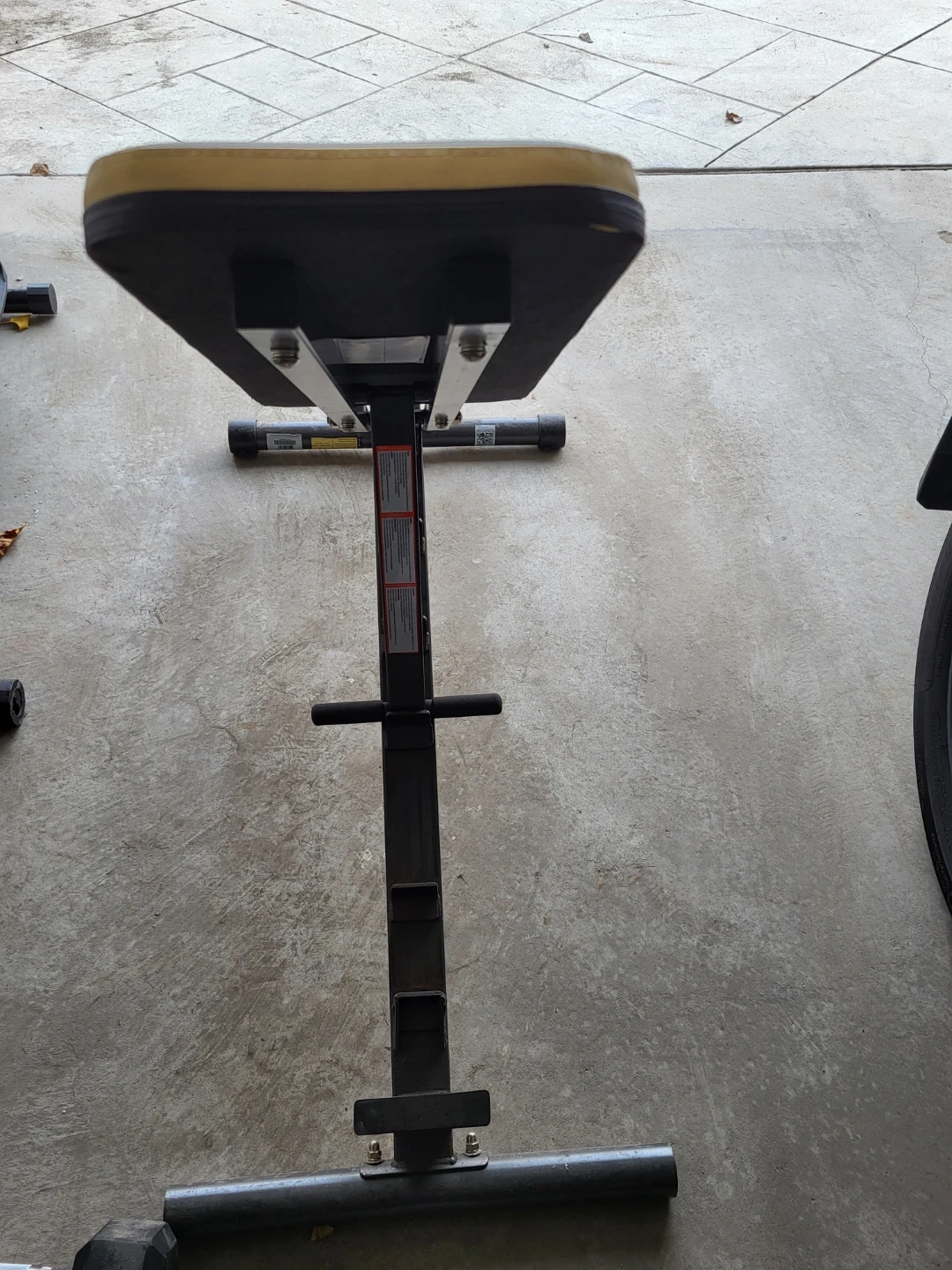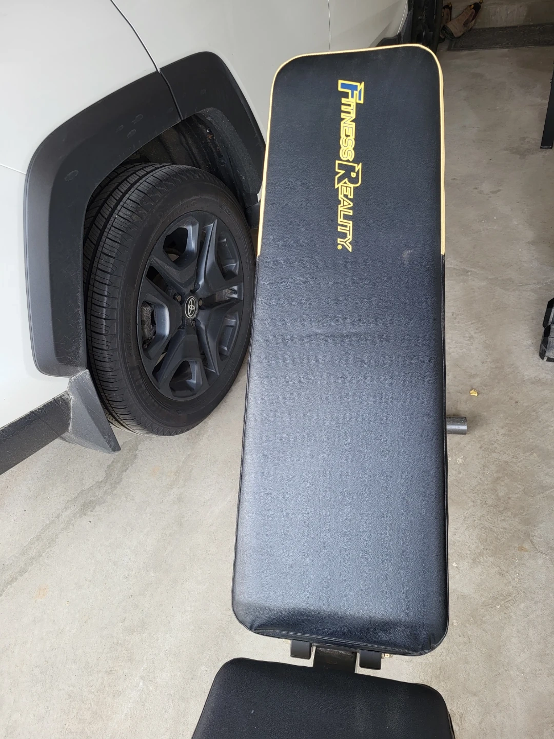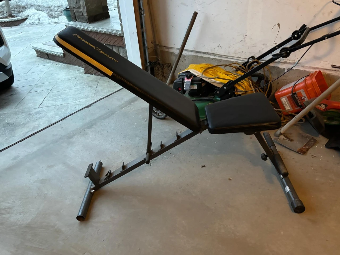 This is a Fitness Reality adjustable weight bench. It's black with yellow accents. This bench is useful for various workout routines.