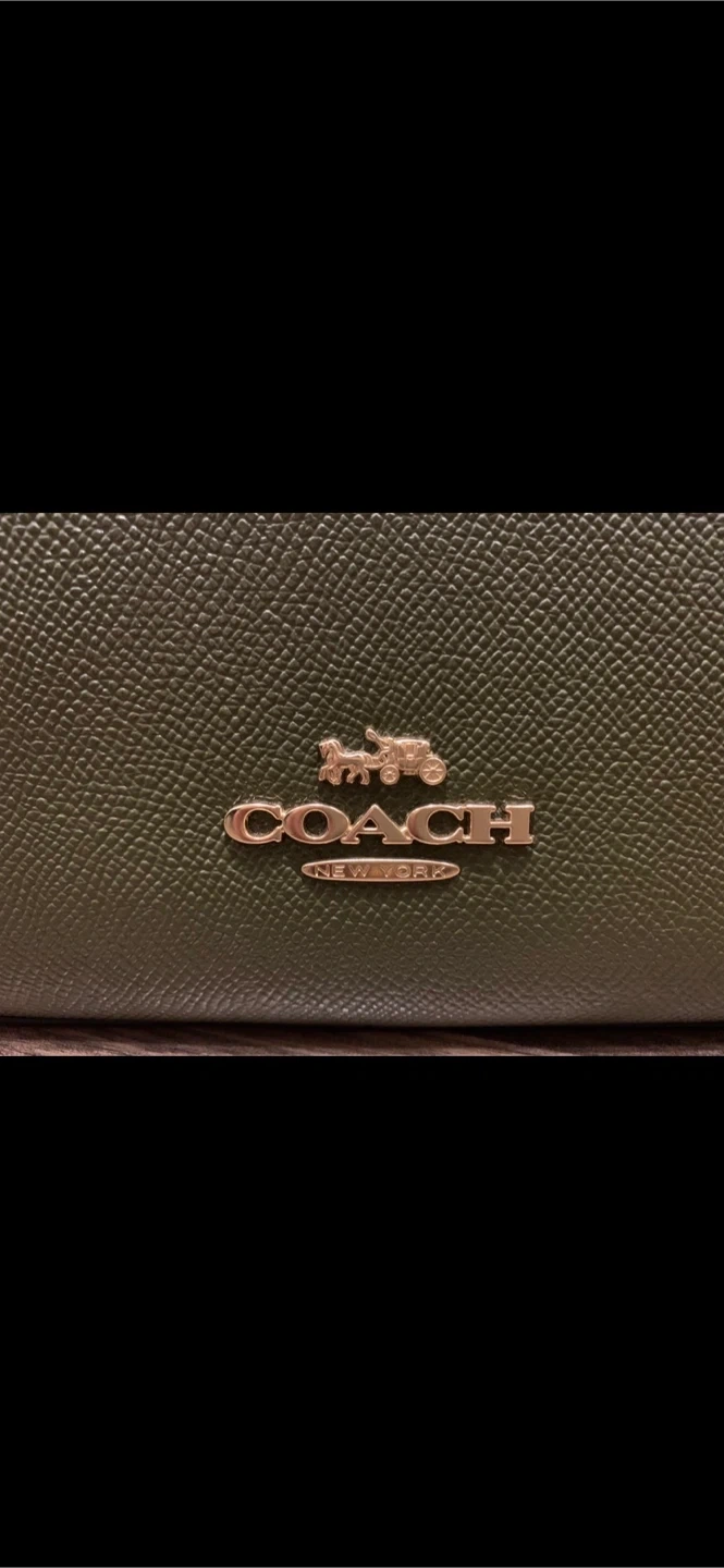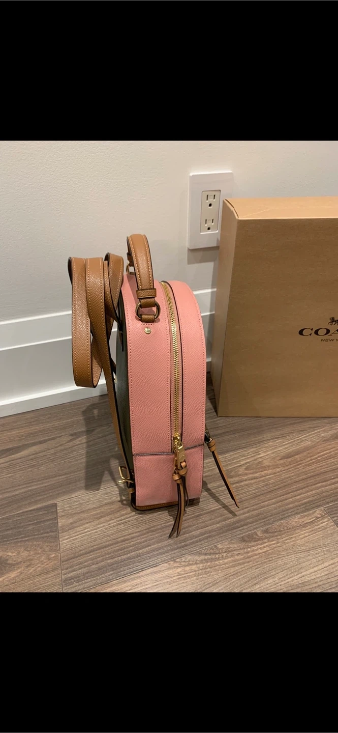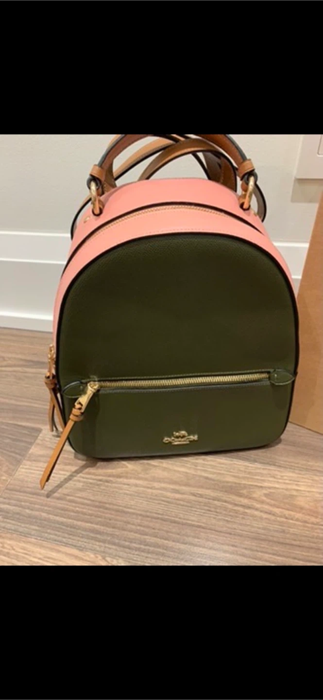 This is a stylish Coach backpack in a two-tone design. It features a pink front and an olive green back with tan leather straps and gold hardware. Includes the original Coach dust bag and box. It's a great accessory for everyday use!