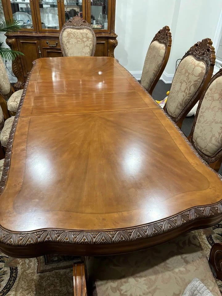 Full Seating for 8: Comes with eight (8) matching high-back chairs. Each chair features plush, intricate damask upholstery and exquisite hand-carved accents on the crowns.