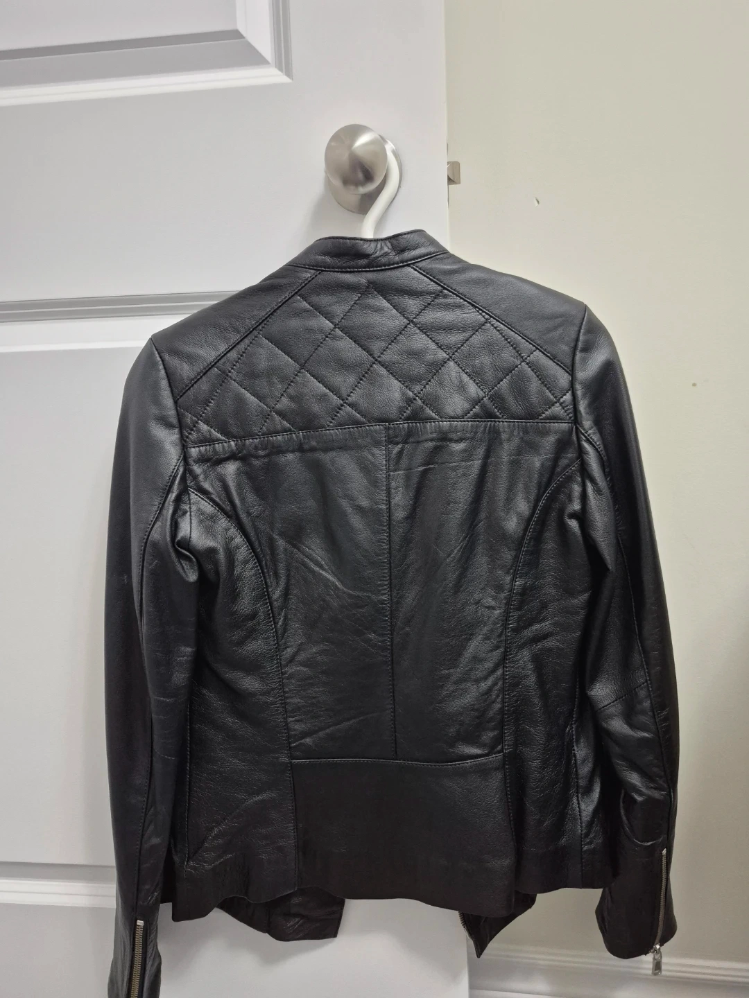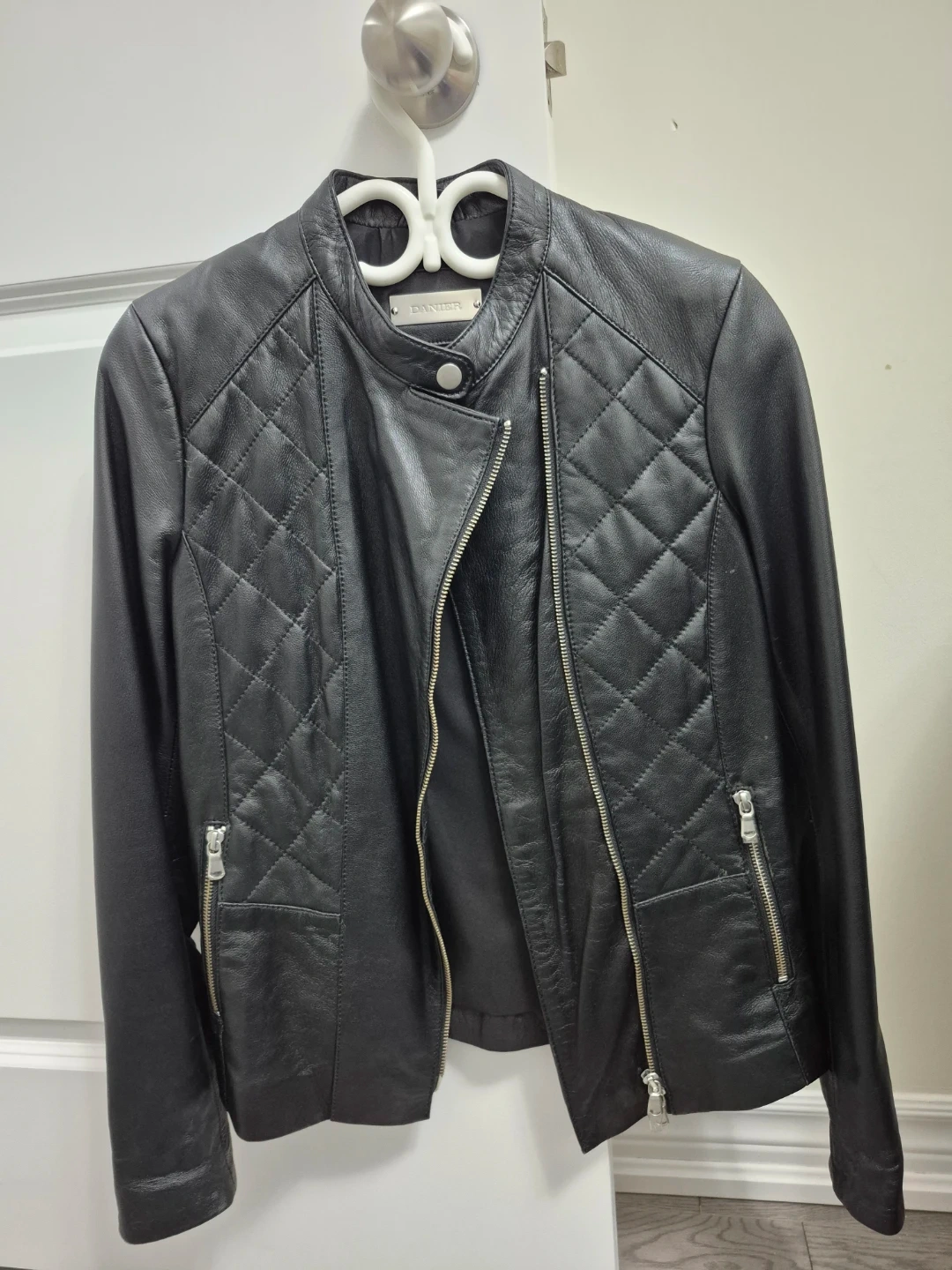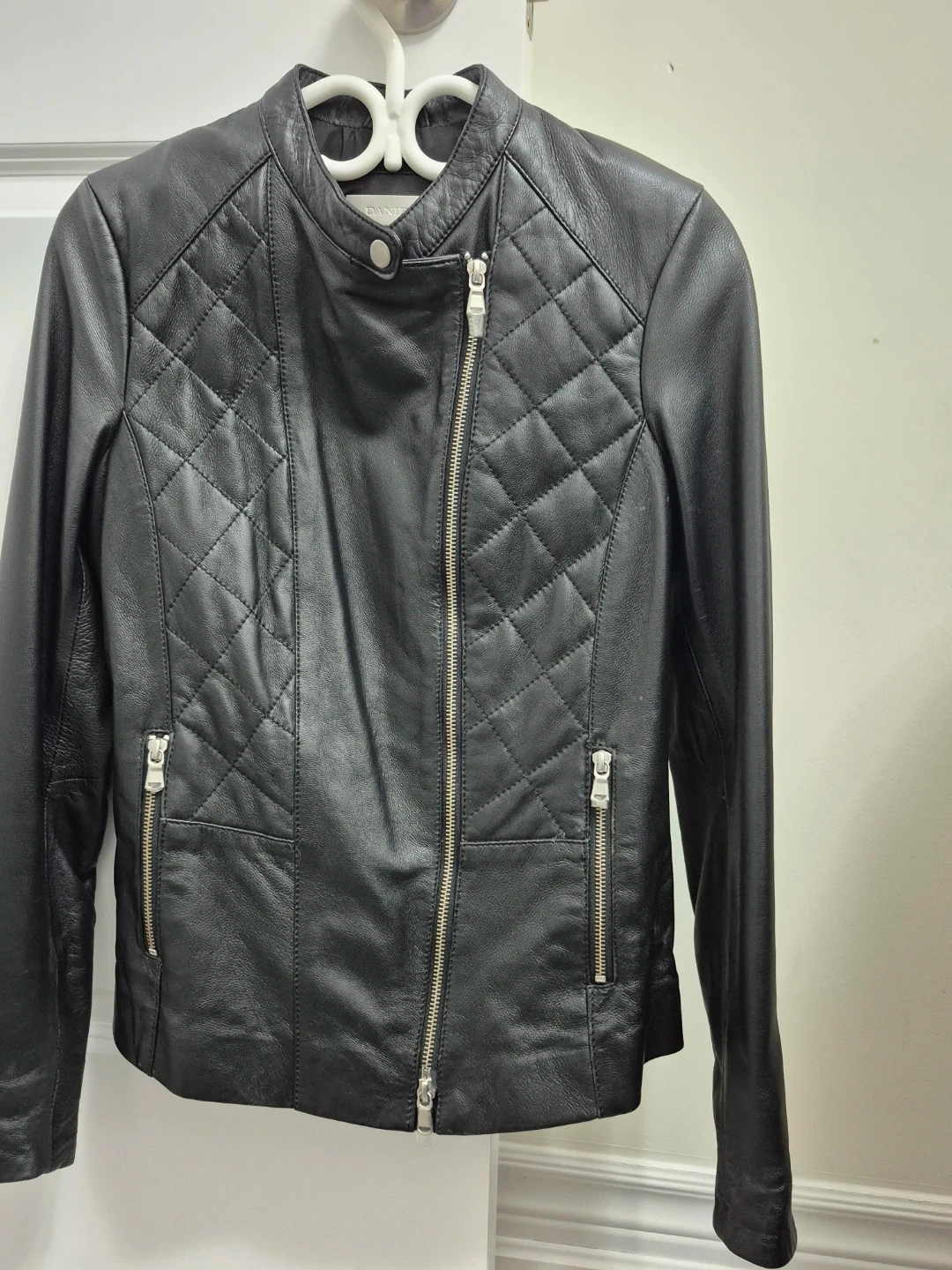 This is a stylish black leather moto jacket from DANIER. It features a quilted design on the yoke and sleeves. The jacket has a full zip front and zippered pockets.
