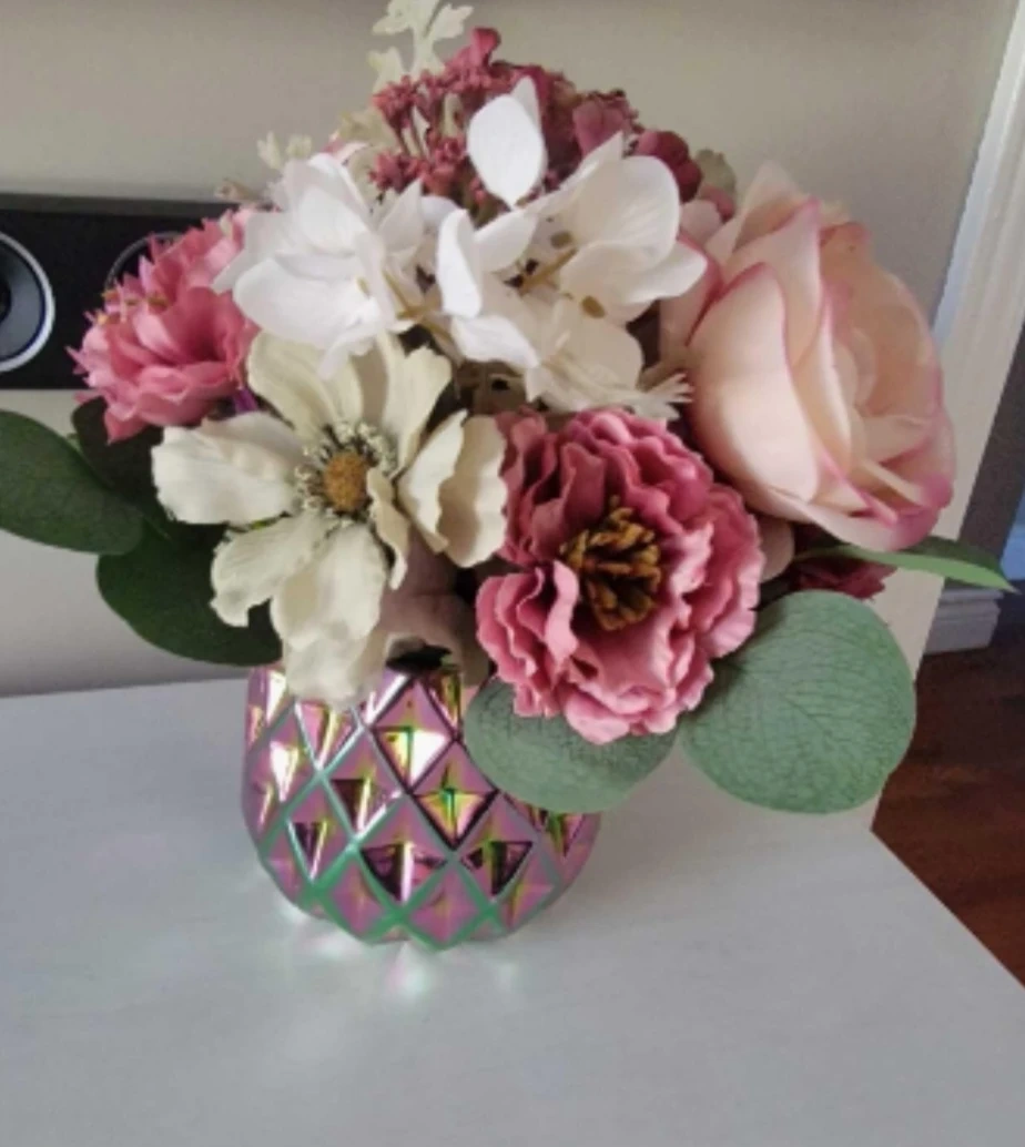 This artificial floral arrangement features a mix of pink, white, and cream-coloured blooms with green eucalyptus leaves. It's housed in a diamond-patterned, iridescent vase. Adds a pretty touch to any room!