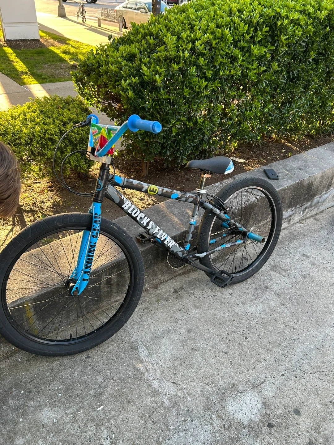 SE Bikes Blocks Flyer BMX bike. Features a gray, black, and blue camouflage design with blue handlebars and seat post. It's a BMX bike for riding.