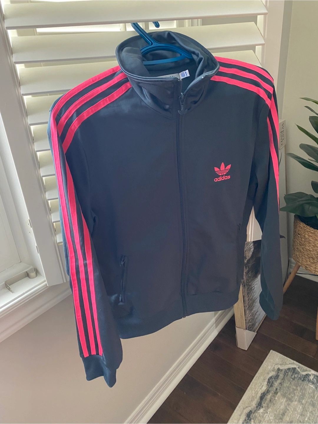 Women’s Grey Adidas track jacket with pink stripes on the sleeves. It's a size medium (M/M). Full zip front with pockets. Only worn once. Pick up in Maple