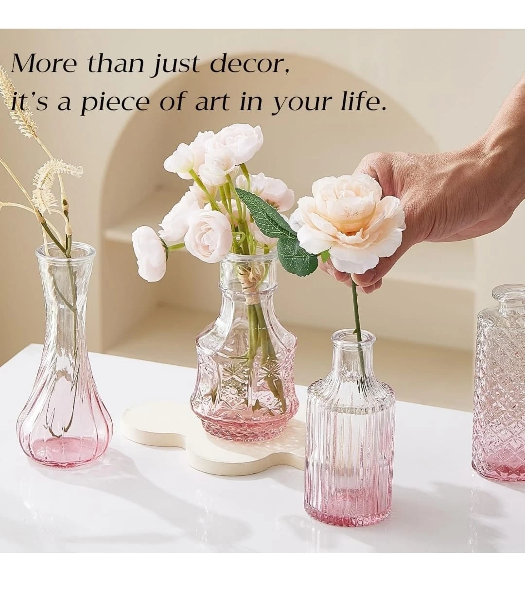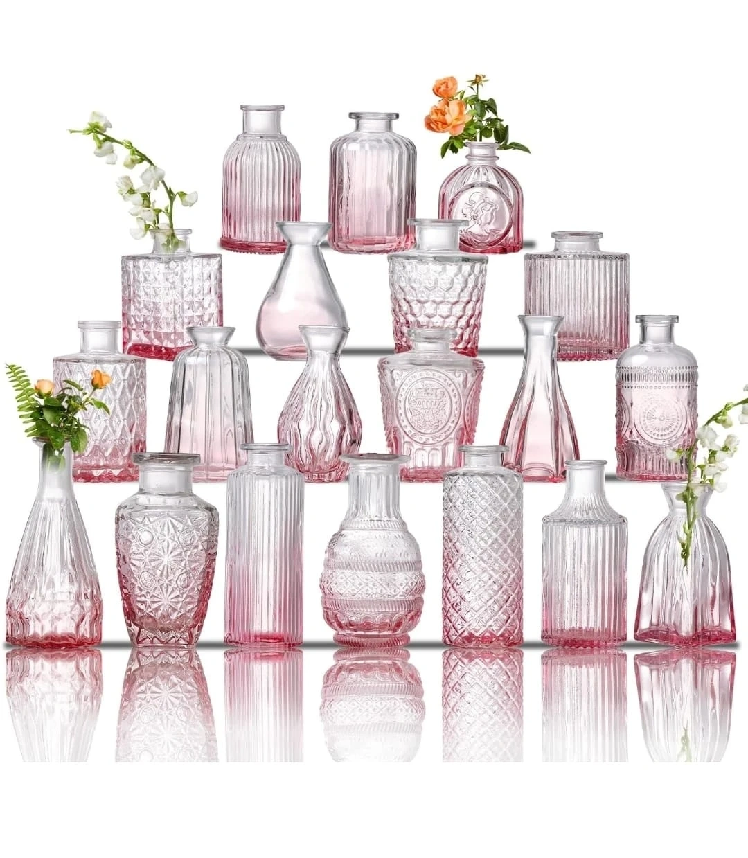 This set includes 18 small pink glass vases in various decorative styles. They're made of glass and come securely packaged in a box with foam inserts. These vases are great for small bouquets or single stems.