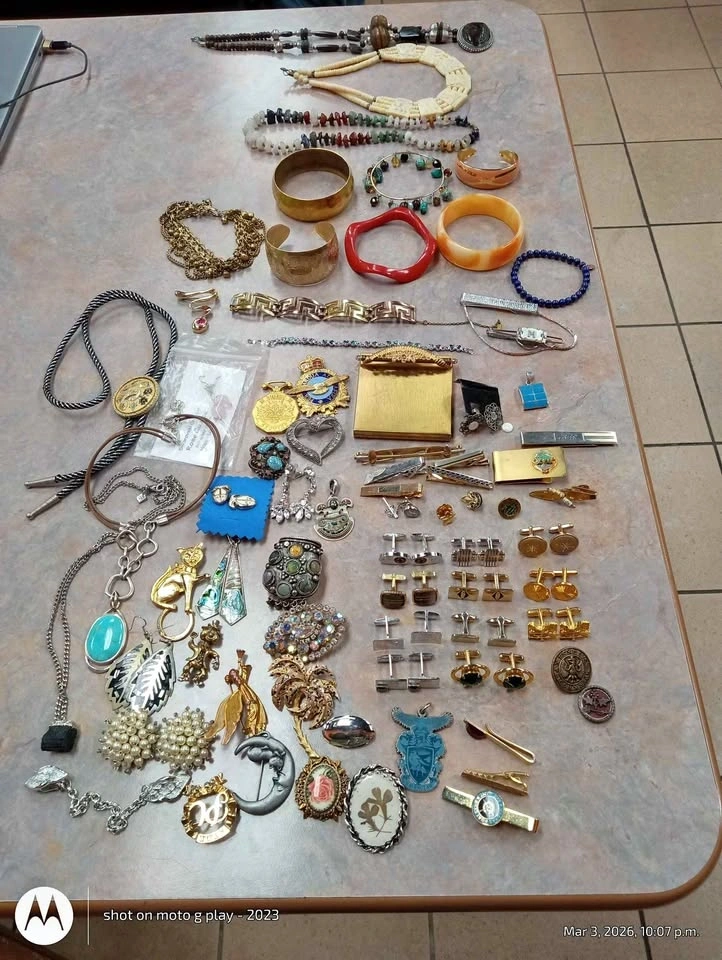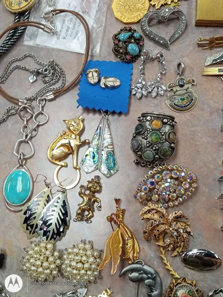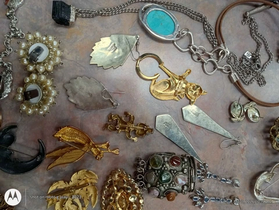 This is a large, assorted lot of vintage jewelry, mostly costume pieces with a few signed items. Condition varies from broken (good for crafts) to wearable. The mix includes clips, cufflinks, earrings, bracelets, necklaces, buttons, and one pocket mirror in fair condition. You can purchase the entire lot for $300, or meet up to see the items in person and create your own smaller lot based on your budget. I'm also open to trades for Mexican Alpaca bangles, brooches, pendants, necklaces, Egyptian revival or Victorian/Victorian Revival jewelry, or Southwest bolo ties. Located in the Vine and Scott area of St. Catharines. Let me know if you're interested!