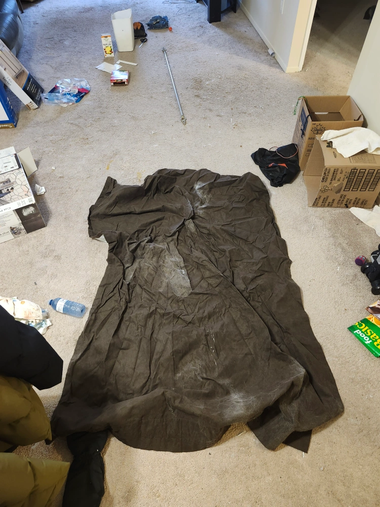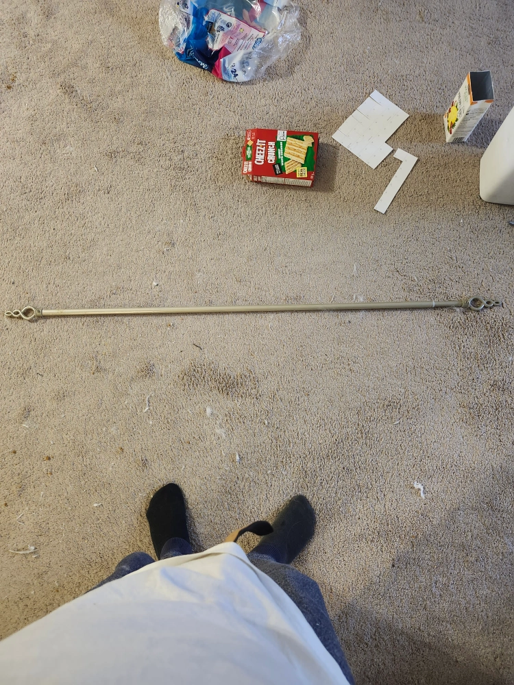 This is a dark brown curtain, likely made of cotton. It's been hung over a window and appears to be a decent size. Also included is a decorative metal curtain rod, complete with finials on both ends. It's great for blocking out light!
