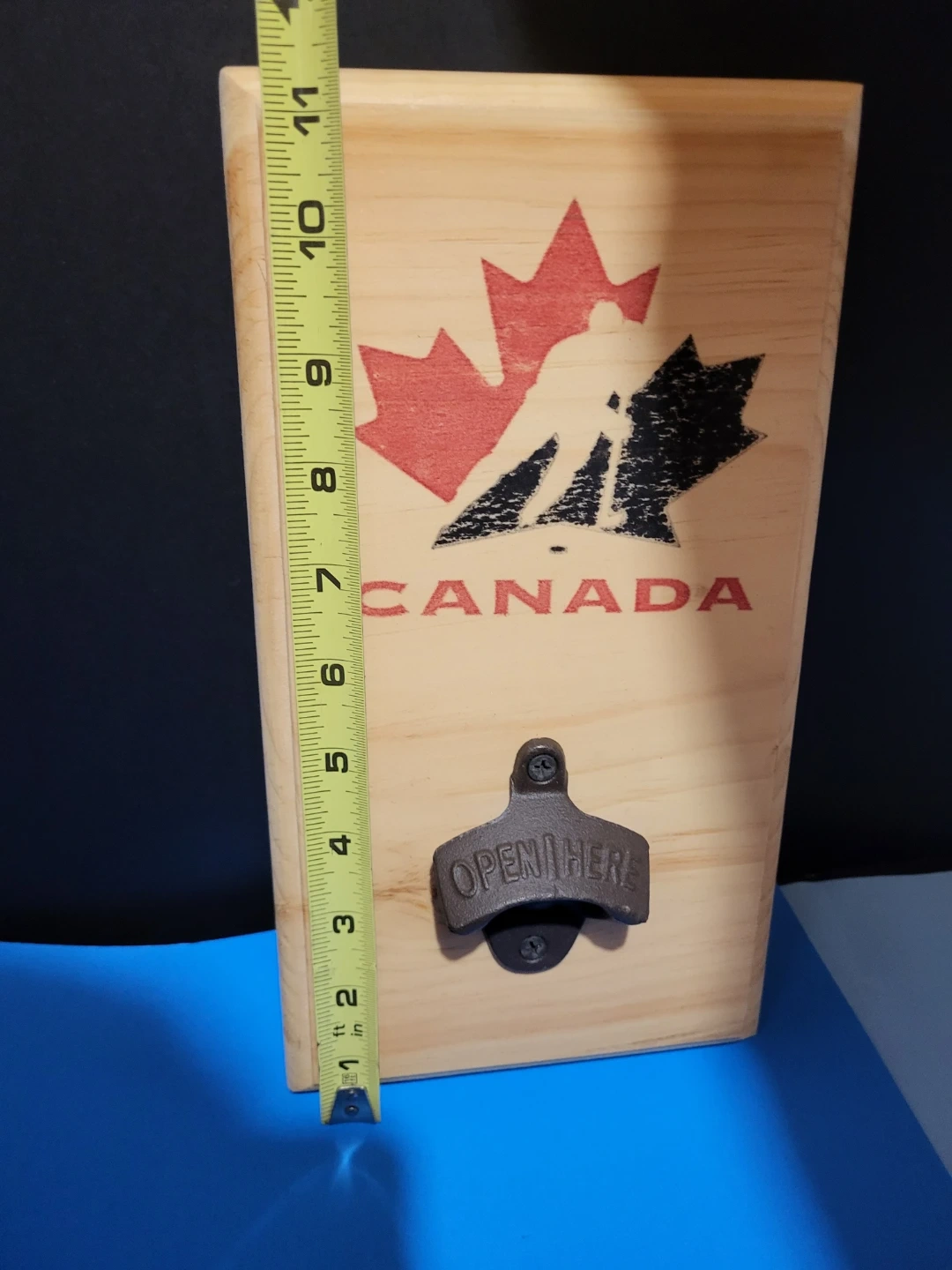 This wall-mounted bottle opener features a classic Canadian maple leaf and hockey player design. It's made of wood with a metal opener.