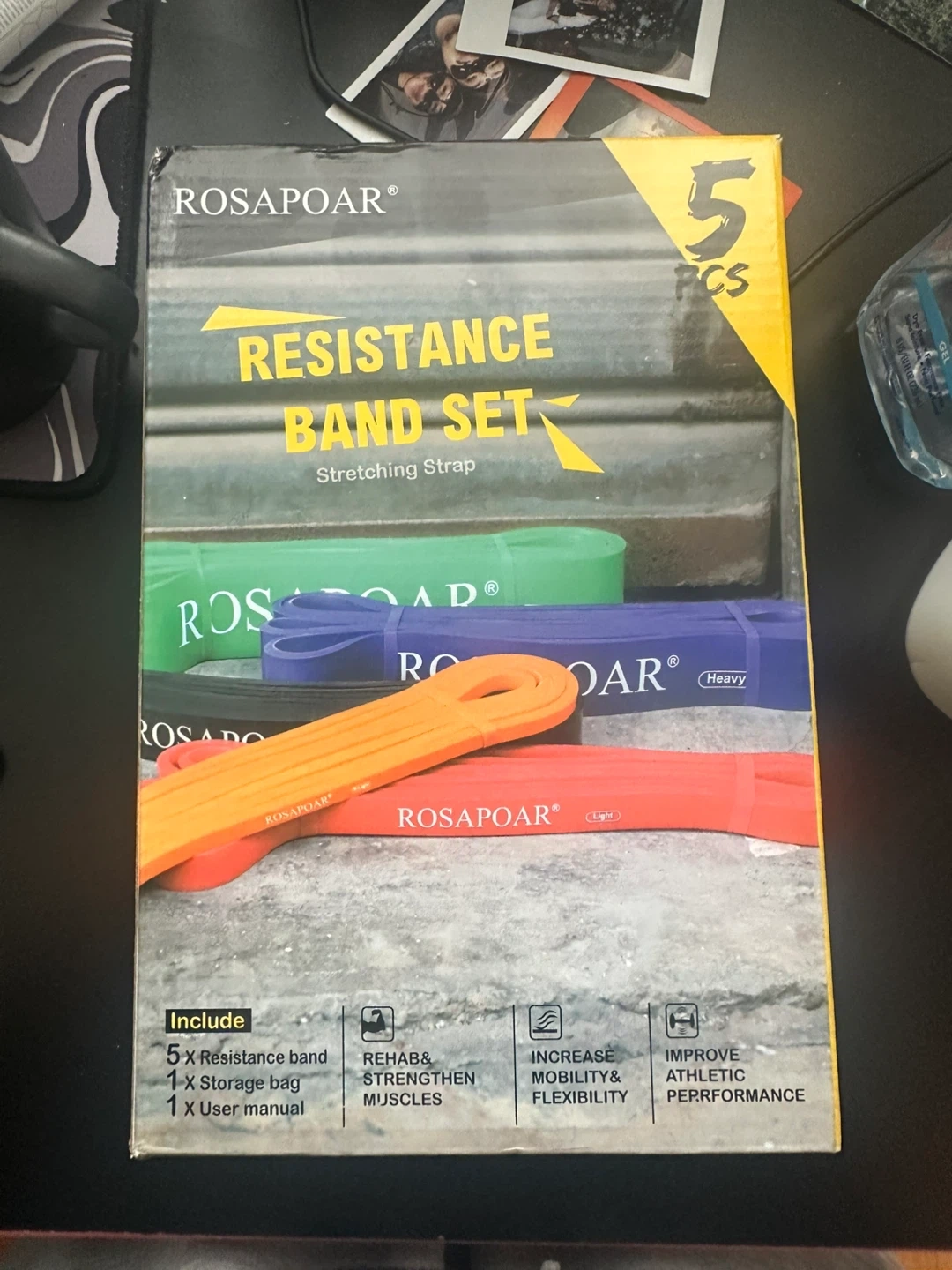 This ROSAPOAR resistance band set includes 5 bands, a storage bag, and a user manual. It's great for stretching, strengthening muscles, and improving mobility. The bands are designed for various fitness levels.