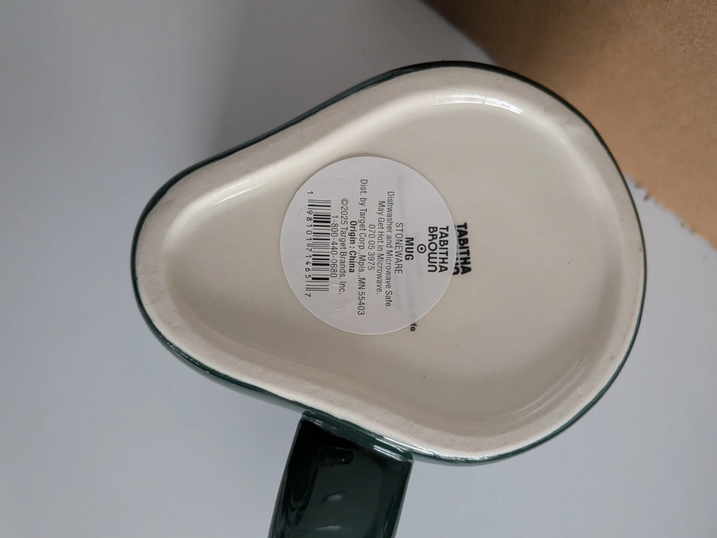 New Tabitha Brown 15.7 Fl Oz coffee mug, a stylish and functional addition to any kitchen. This mug features a unique avocado shape with a striking green exterior and a contrasting light green interior, adding a pop of colour to your morning coffee or tea. This stoneware mug is both dishwasher and microwave safe.