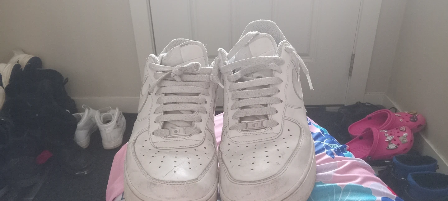 White Nike Air Force 1 sneakers. Leather upper with lace-up closure. These kicks are a classic for a reason!