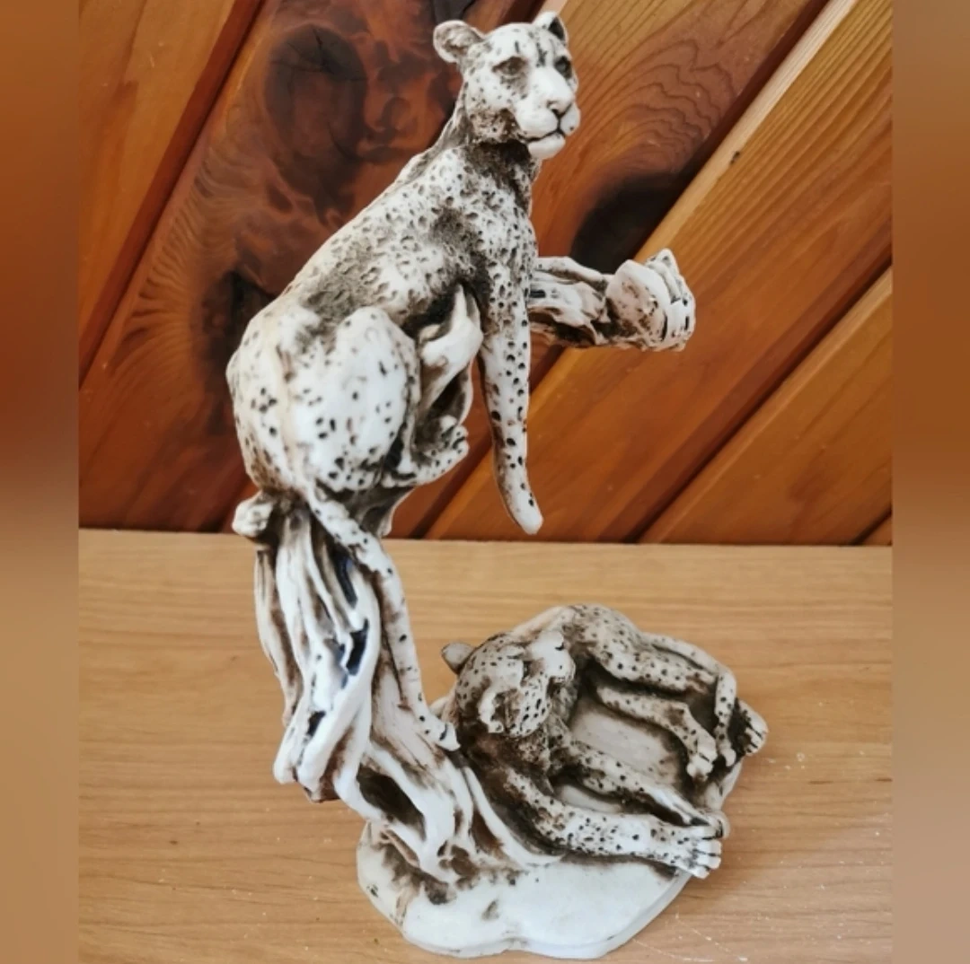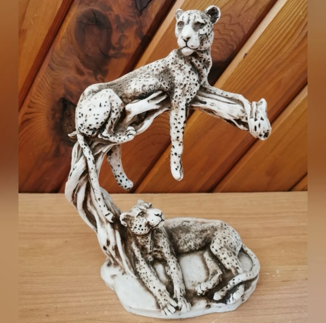 Vintage wildlife sculpture featuring two cheetahs resting on a sculpted tree branch, beautifully detailed with hand-painted spots and naturalistic posture