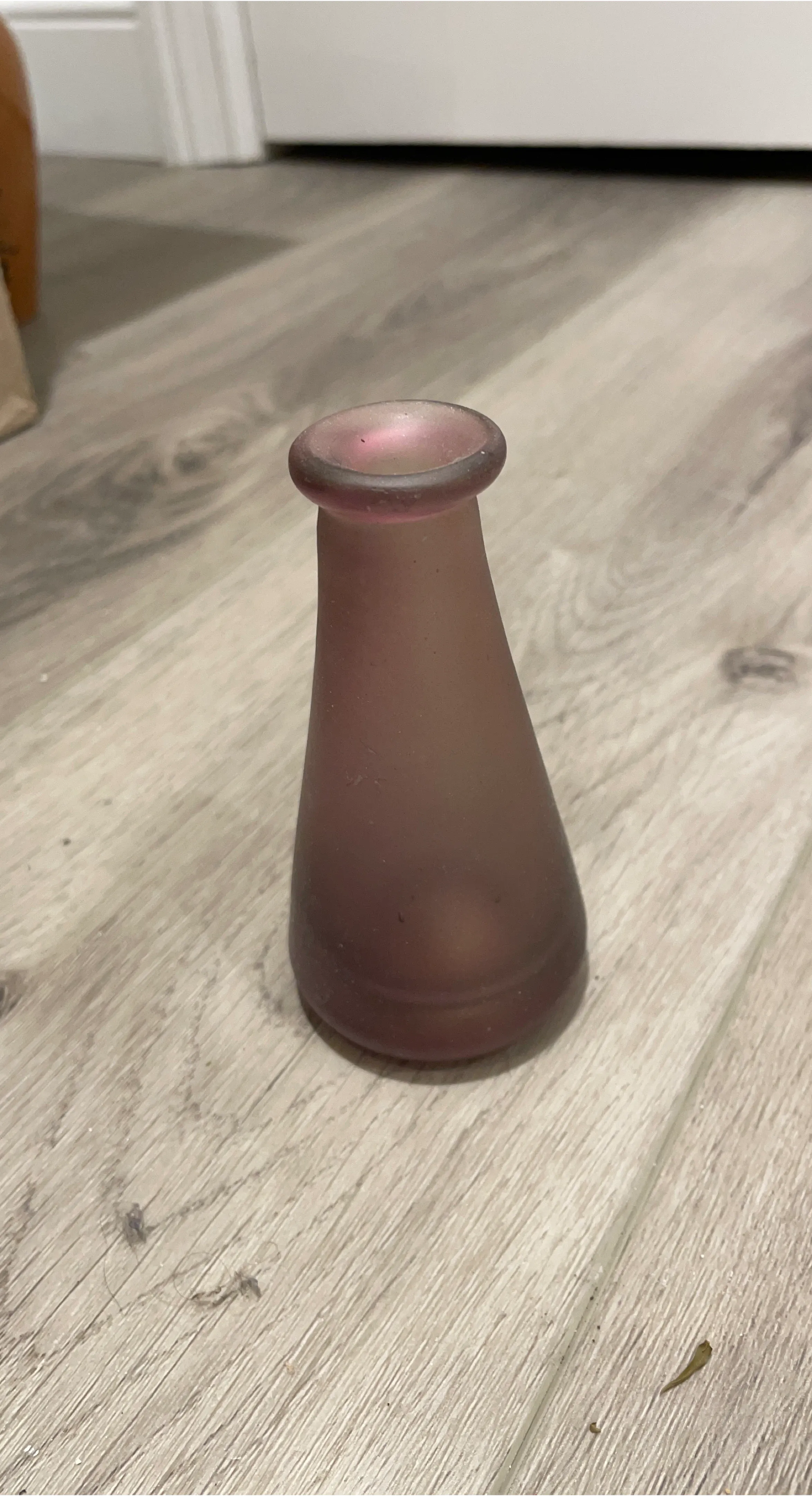 This is a frosted glass bud vase. It has a unique shape with a wider base and a narrow opening. Perfect for a single stem or small floral arrangement!