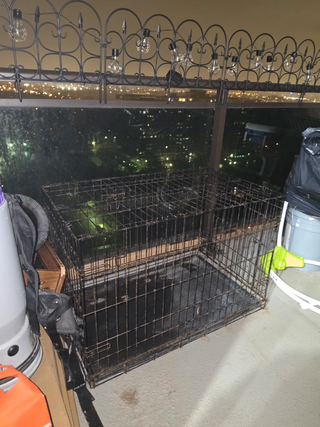 XLarge wire dog crate. It has a wire construction with a removable plastic tray. Folds flat for storage. It needs to be cleaned.