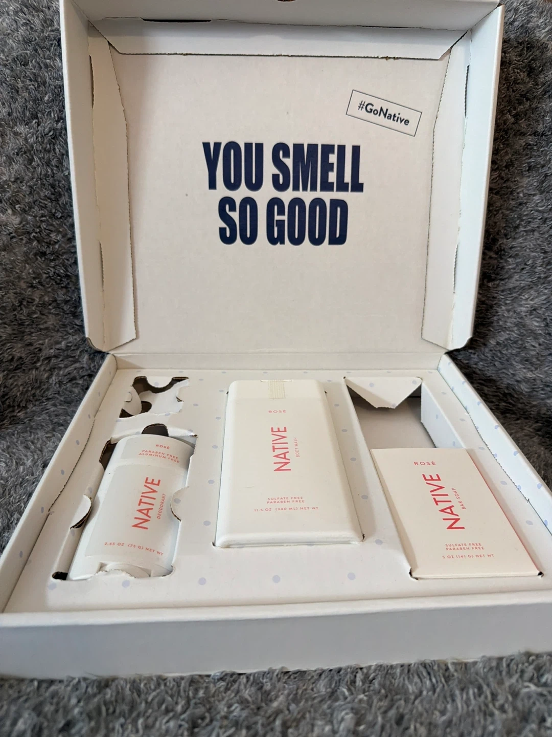 This Native gift set features rose-scented body wash, deodorant, and bar soap. The body wash is 11.5 OZ (340 ML) and is sulfate and paraben free. The deodorant is 2.65 OZ (75 G) and is aluminum and paraben free. It's a great way to try out multiple Native products!