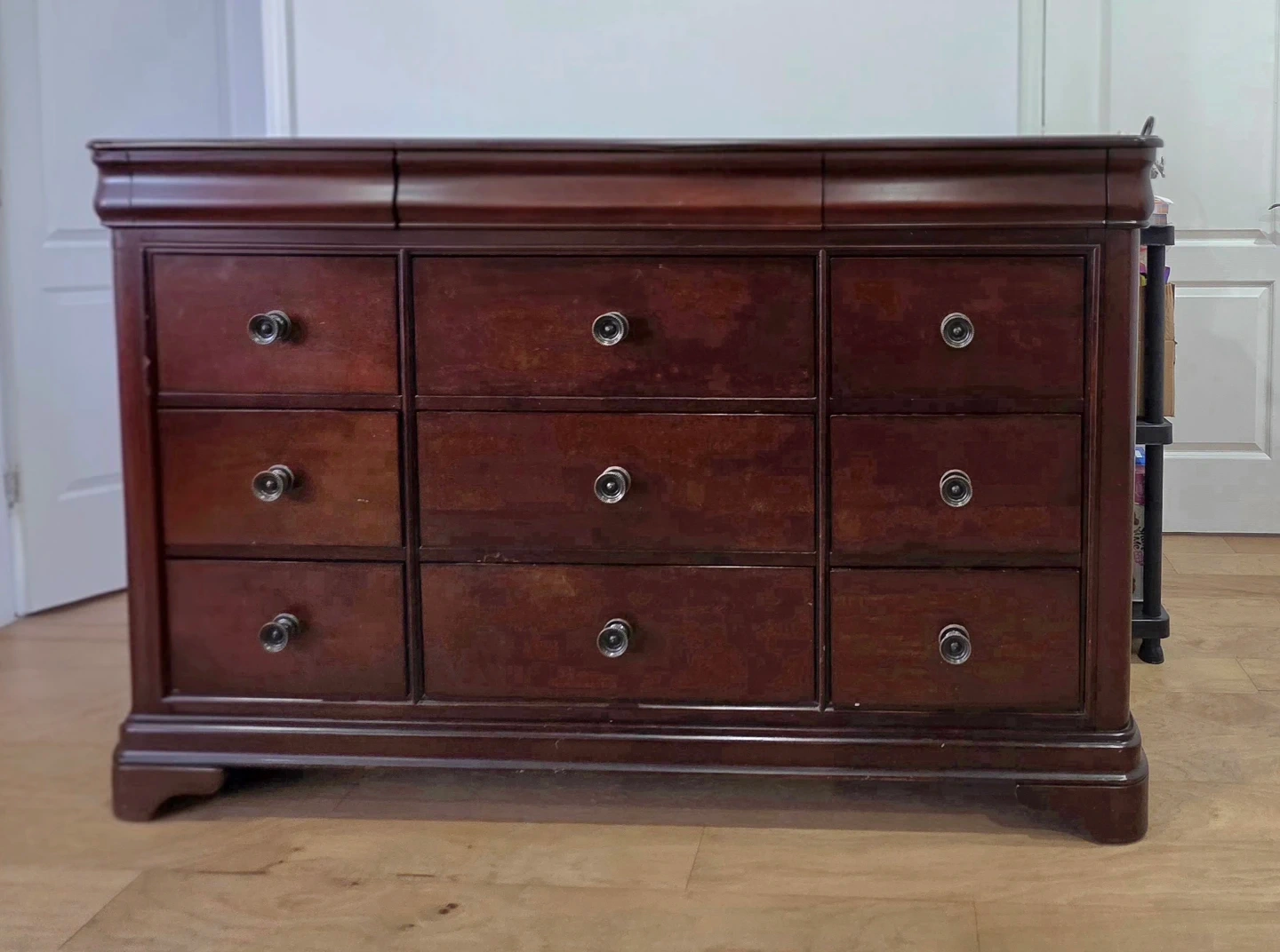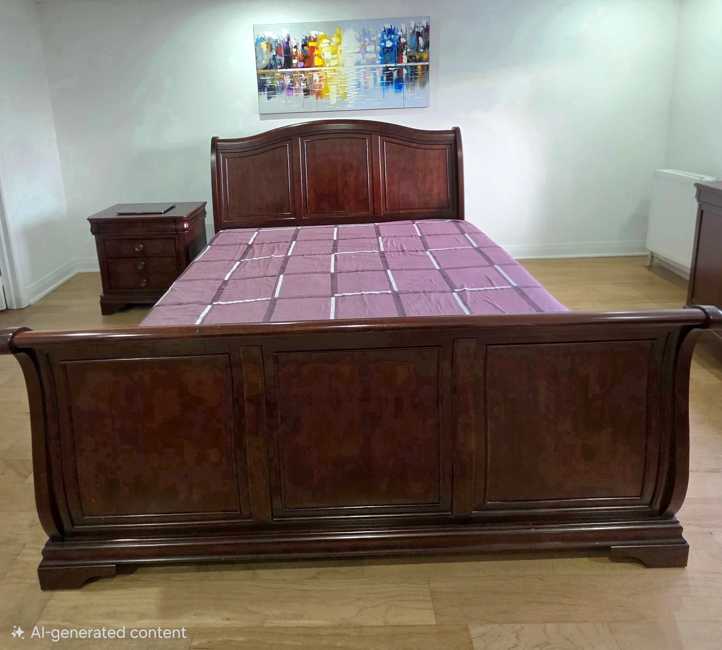 This is a solid wood sleigh bed frame with a matching dresser. The bed frame features a curved headboard and footboard with paneled detailing. The dresser has nine drawers with round metal pulls, offering ample storage space. It's a sturdy set made for a bedroom.