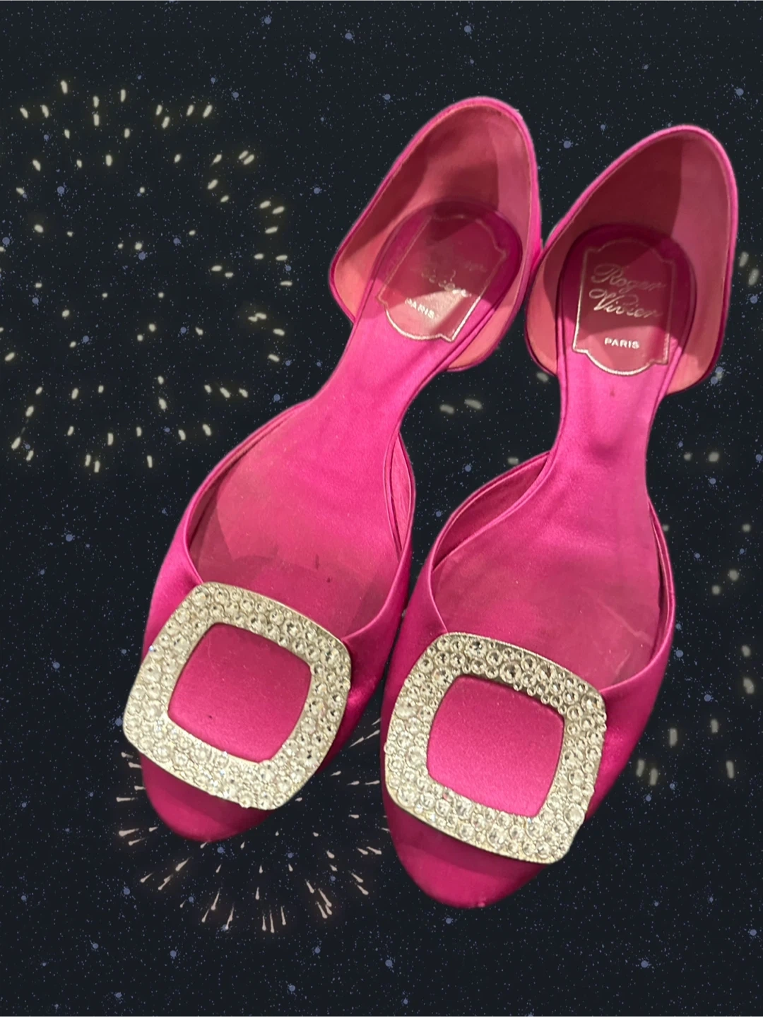 Gorgeous Roger Vivier flats in a vibrant pink satin. They feature the iconic crystal buckle detail and a chic D'Orsay silhouette. The insoles are branded and made in Italy. Perfect for adding a touch of glamour to any outfit!