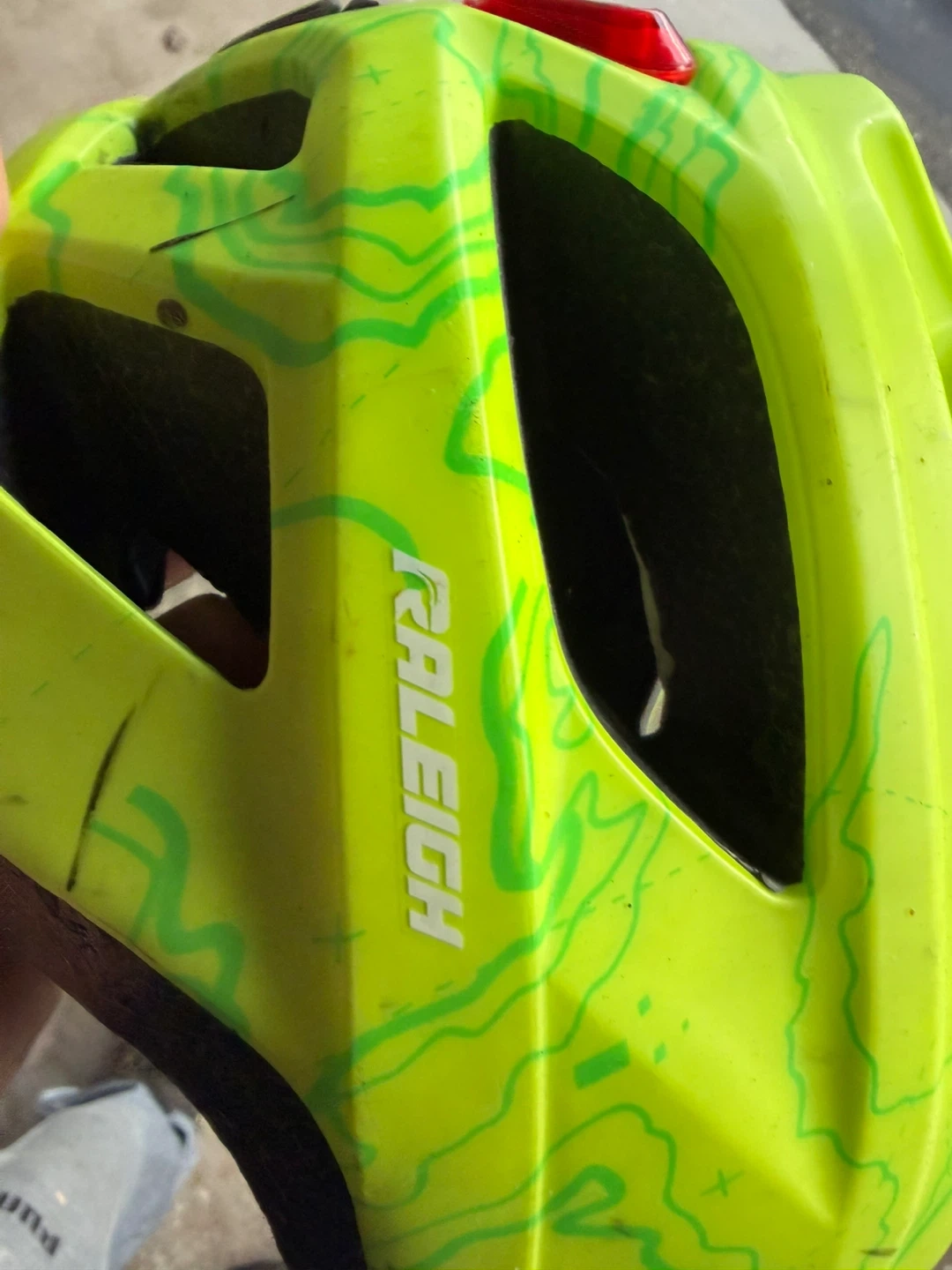 This Raleigh bike helmet is a bright lime green with a cool topographic design. It's equipped with an integrated red rear safety light for increased visibility. Multiple vents help keep you cool on your rides.