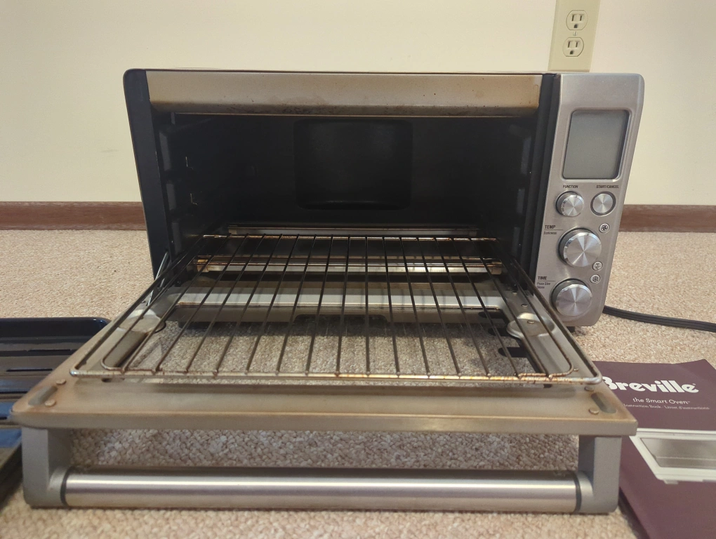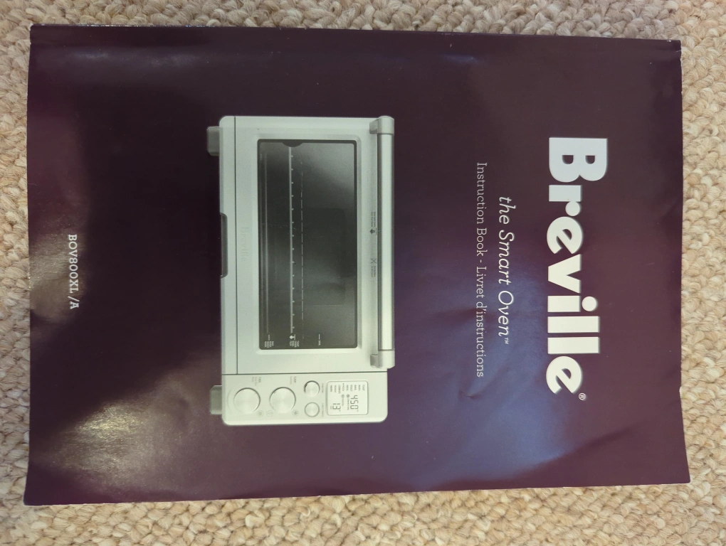A Breville Smart Oven. Includes a broil tray, baking pan, and the instruction booklet. Any great addition for making quick and easy meals at home.
