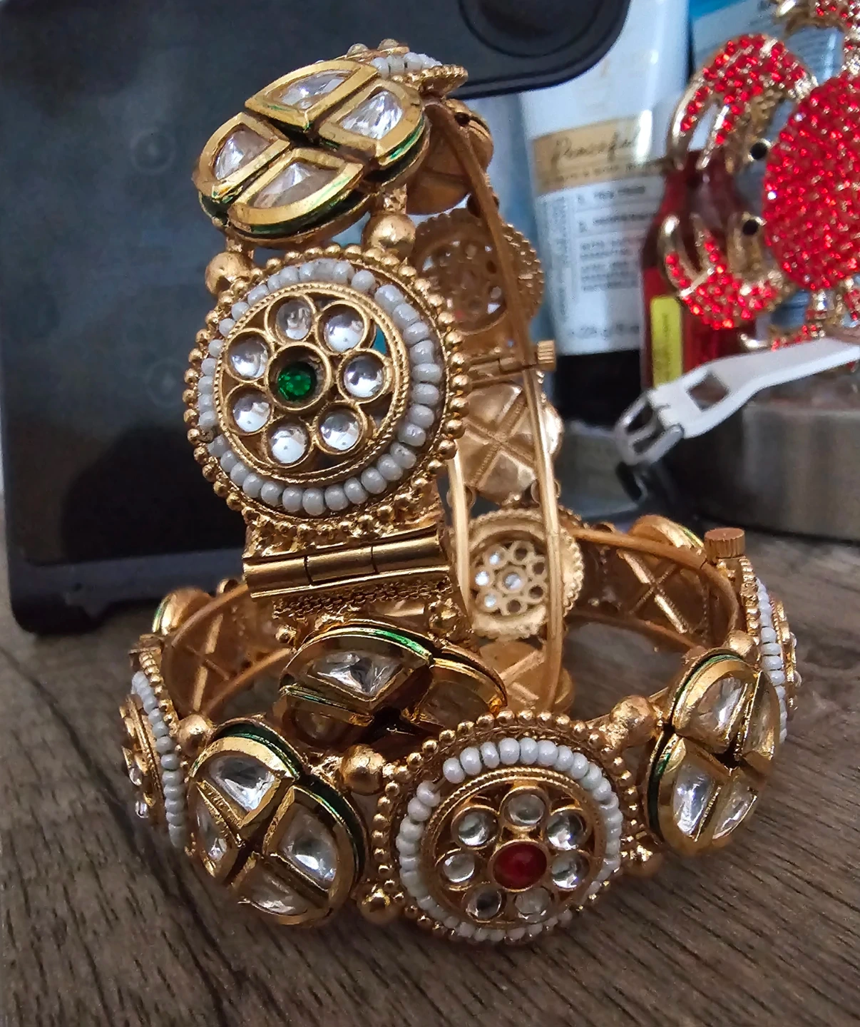 Selling a set of two beautiful gold-tone Kundan bangles. These bangles feature intricate designs with white and coloured stones. Perfect for adding a touch of elegance to any outfit!