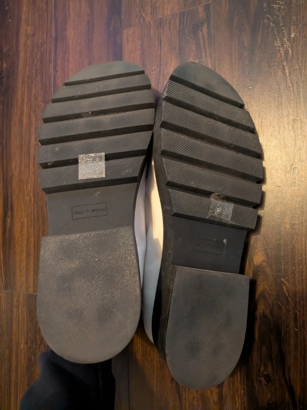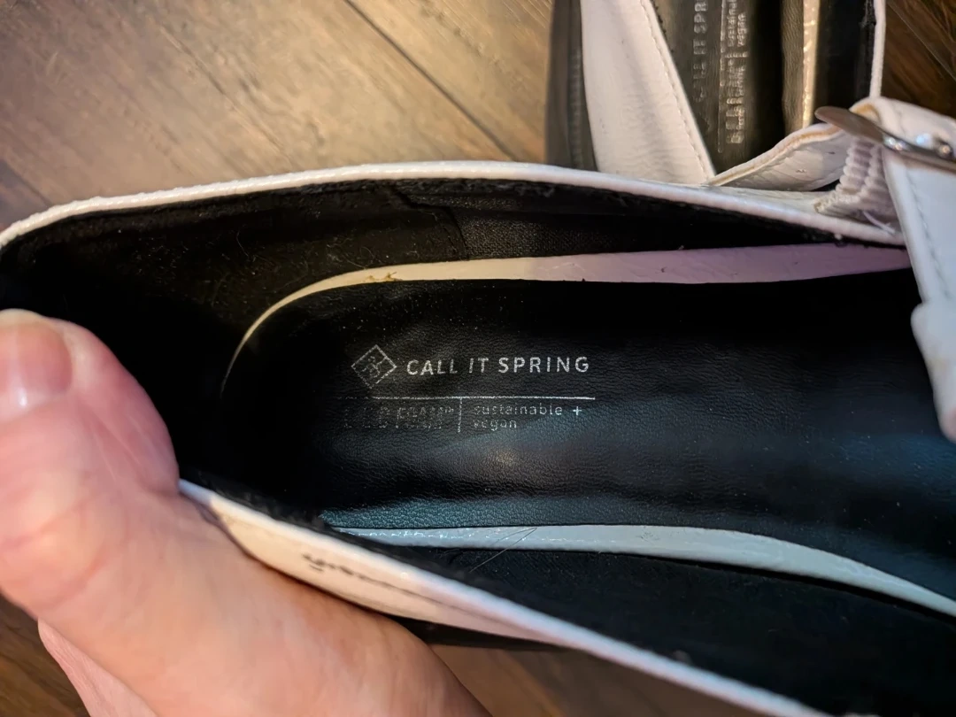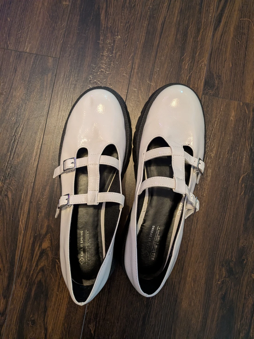 These white patent Mary Jane shoes are from Call It Spring. They feature a glossy finish and buckle closures. The soles are thick and treaded. Features BED foam. Size 11 in new condition