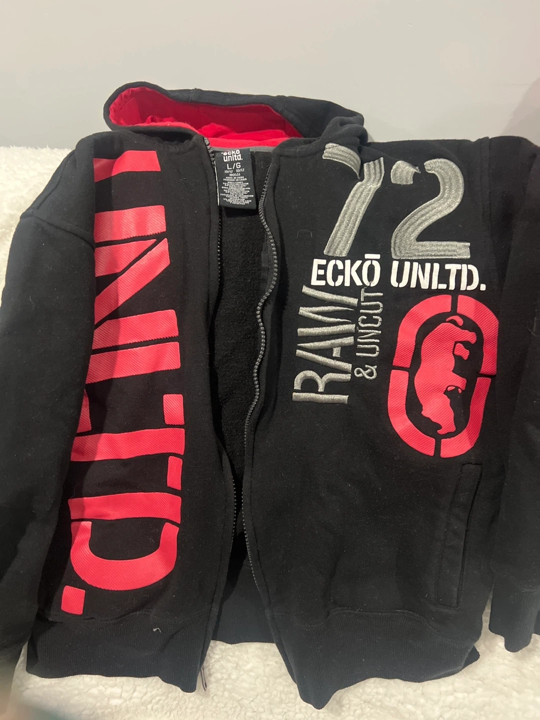 103Selling an Ecko Unltd. hoodie in size L (BOYS)It's black with red accents. The hoodie is in good condition and ready for a new owner!