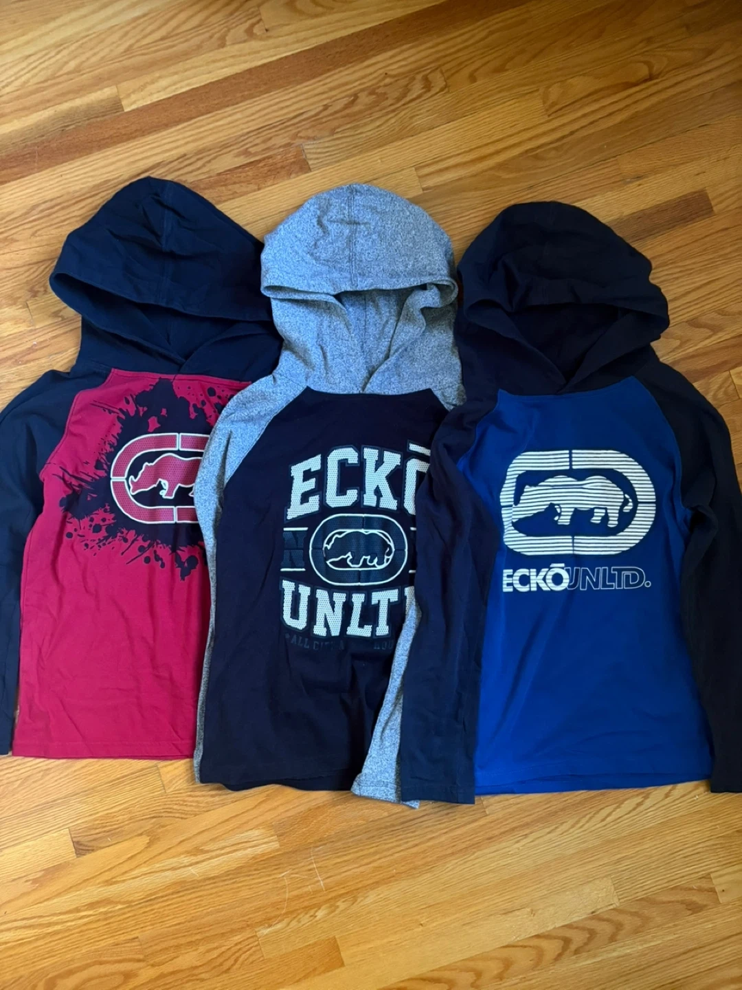 5Selling three Ecko Unltd. hoodies in youth size large. One is red and black, another is blue and black, and the third is grey and black. All are in great condition and ready for a new home!