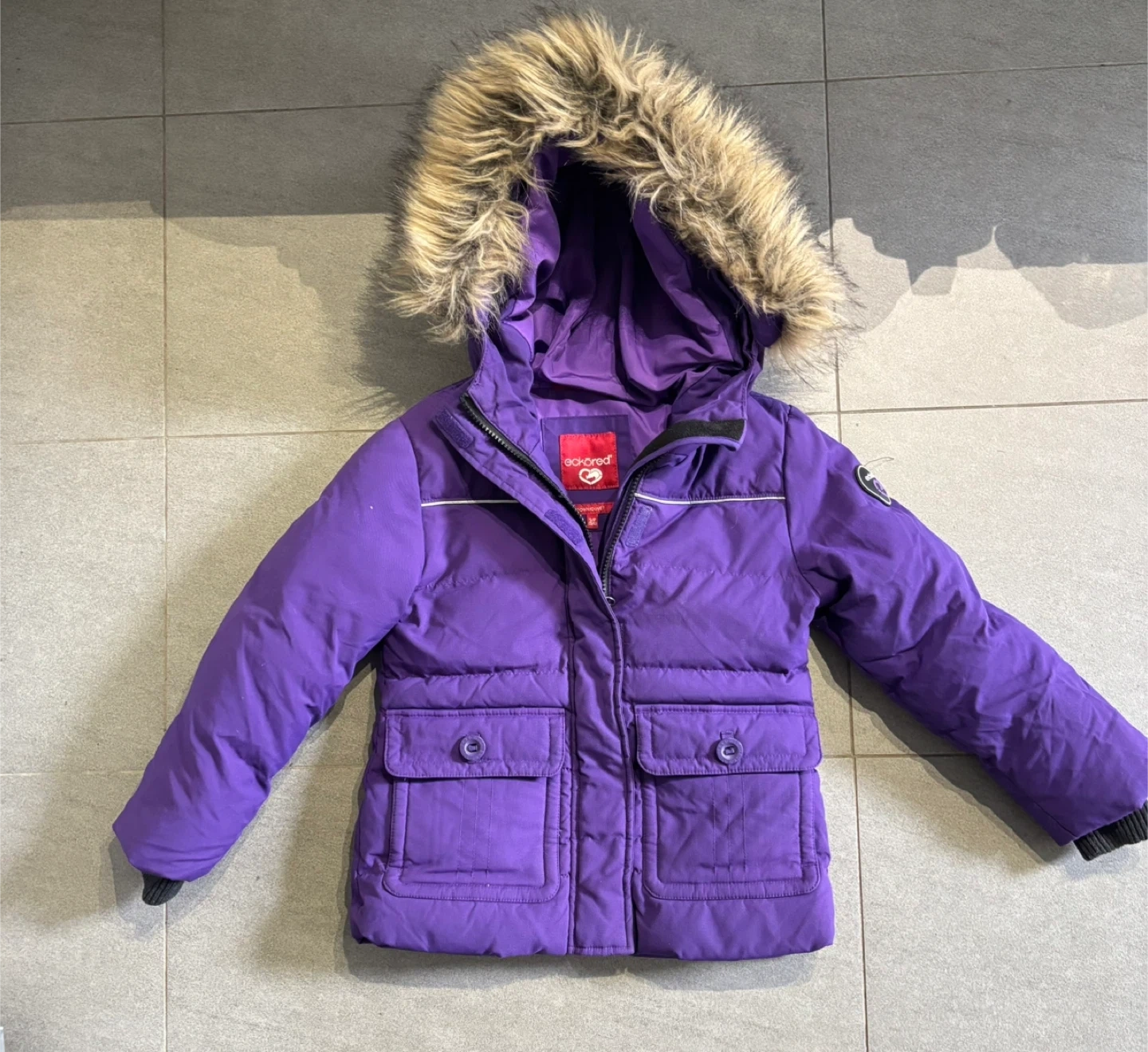 60Cozy Eckored winter jacket in a vibrant purple colour! It's a size S, perfect for staying warm during the colder months. The jacket features a faux fur-trimmed hood and a down/duvet filling to keep you nice and toasty!