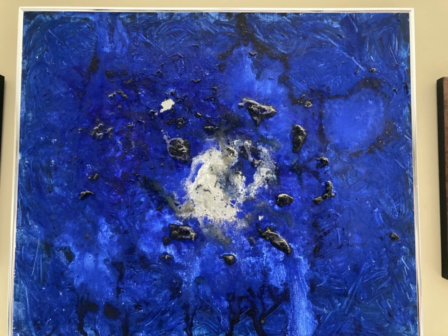 Large framed abstract painting. Dominated by shades of blue with grey and black accents. Textured paint application.