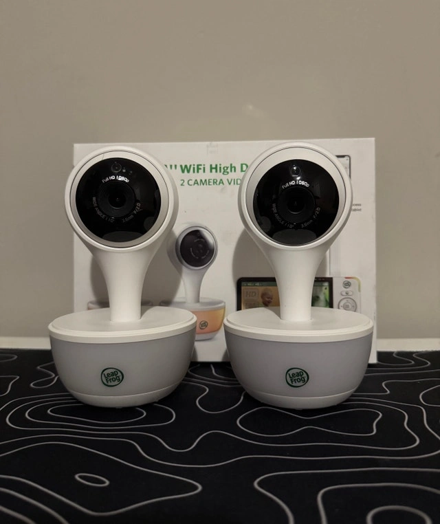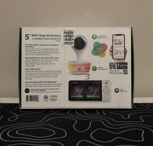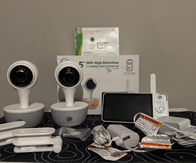 Monitor your baby from anywhere with this 5″ HD baby monitor featuring 2 cameras, full-color night vision, and WiFi connectivity. View and listen remotely on multiple devices through the LeapFrog Baby Care app with no fees or subscriptions. Features: 5″ HD color LCD display, 2 cameras included, WiFi connectivity for remote viewing, Color night vision, Adaptive color night light, Temperature & humidity sensor, Sound & light profile from WeeSleep™, Professional in-app sleep advice and videos, Free 15-minute consultation with a WeeSleep™ expert, All cables and accessories included. Condition: Open box new, fully tested and working perfectly. You can test it in person before purchase. Pickup near Rossland Rd & Brock Rd, Ajax. Cash only.