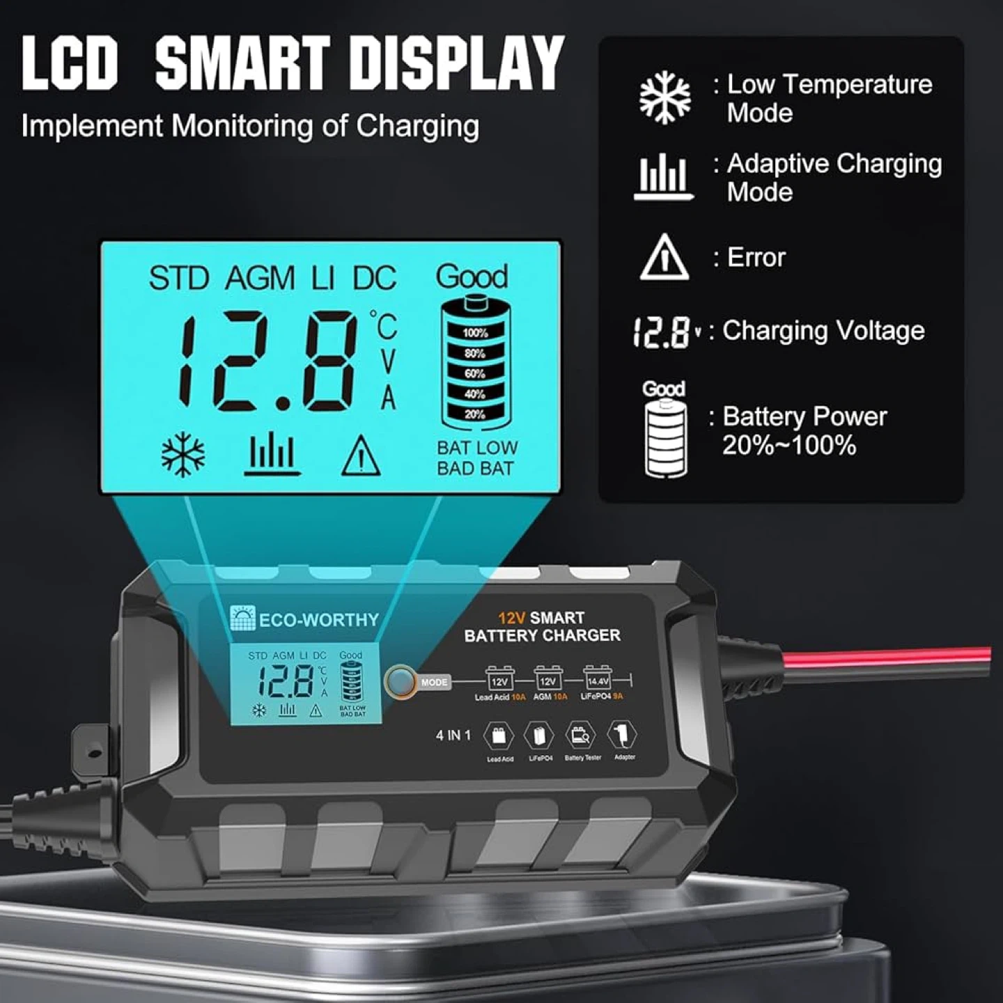38Selling an ECO-WORTHY 12V smart battery charger. It's a 4-in-1 charger suitable for lead-acid, LiFePO4, and gel batteries. The LCD smart display implements monitoring of charging with a clear voltage reading.