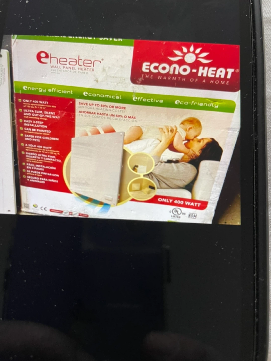 10Selling an Econo-Heat wall panel heater. It's an energy-efficient and eco-friendly way to heat your space. This heater is only 400 watts and is designed to be ultra-slim, silent, and out-of-the-way. It's easy to install and can even be painted to match your decor!