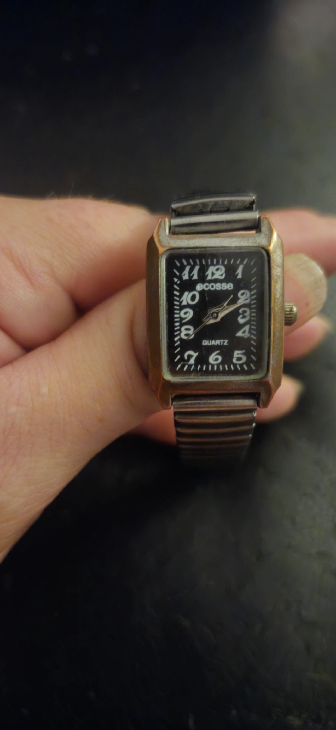 This is an Ecosse ring watch with a black face and stretch band. This watch is in good condition, perfect for those who appreciate unique timepieces. I'm not entirely sure of the exact age, but it certainly carries a vintage charm, dontcha think? Timeless treasures await, but remember, if the ad's still up, it's still available! Don't miss out!