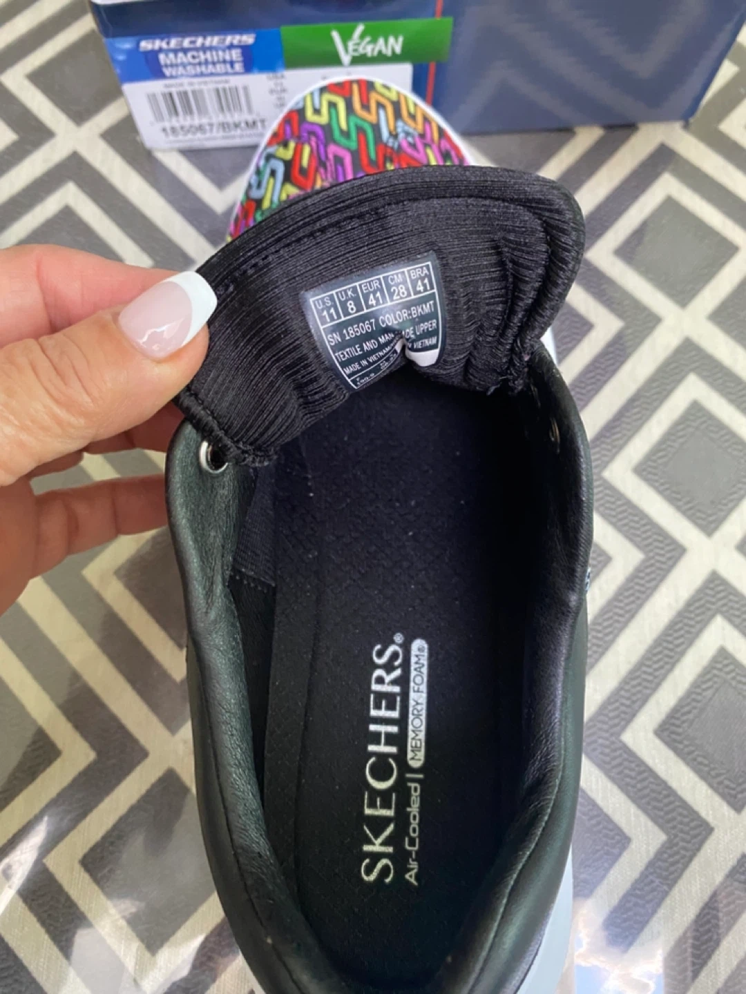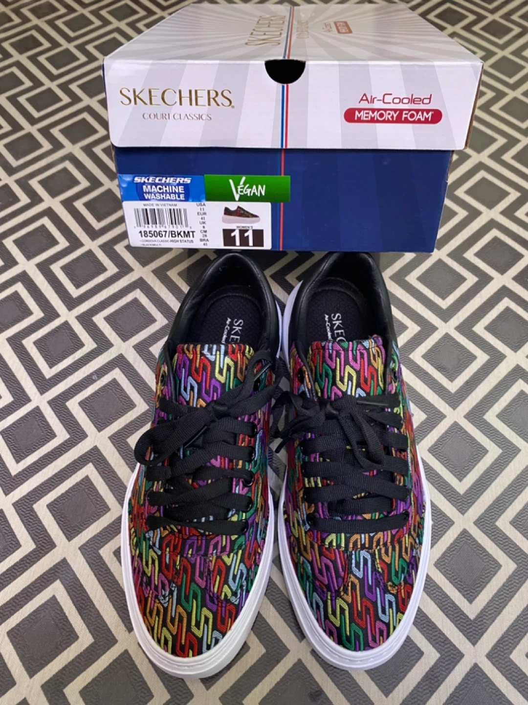 These are Skechers Court Classics sneakers in a size 11 US. They feature a colourful embroidered pattern and "Air-Cooled Memory Foam" for comfort. These shoes are also machine washable and vegan!