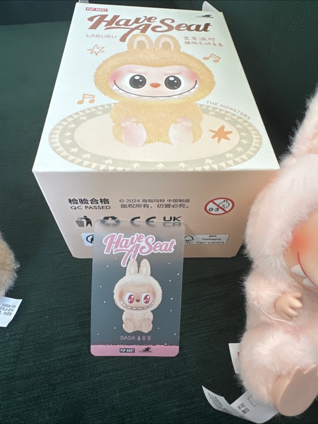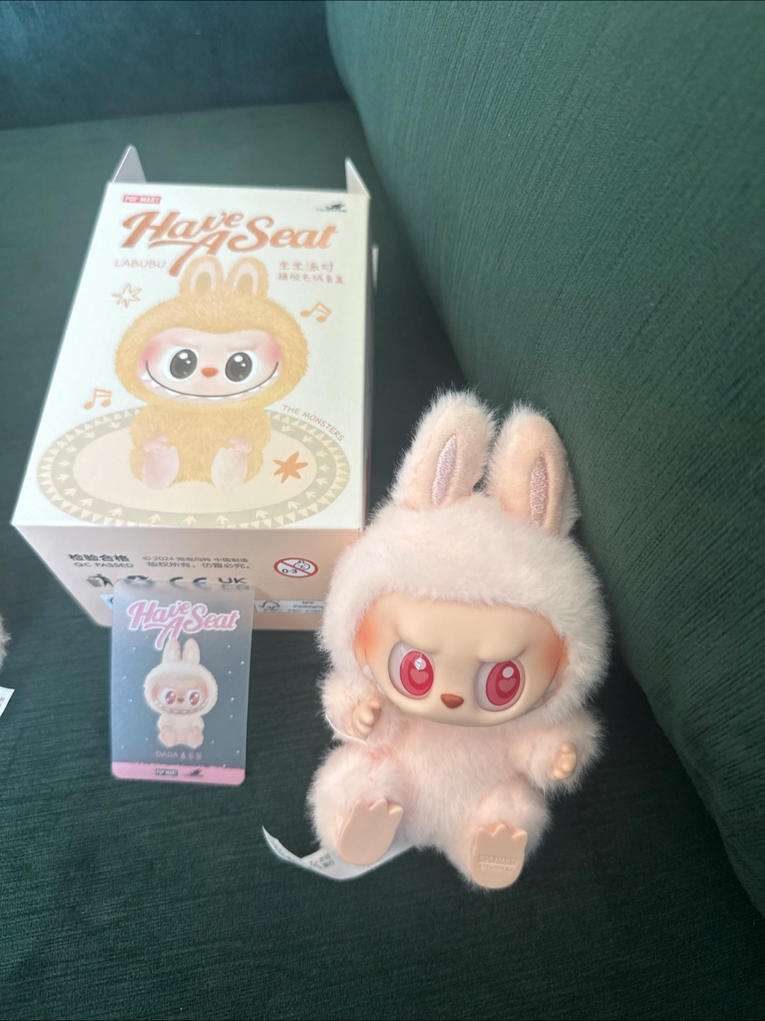 Adorable pink bunny plush. Part of the Have a Seat Labubu The Monsters collection. Comes with original box and tag. Collectible item.