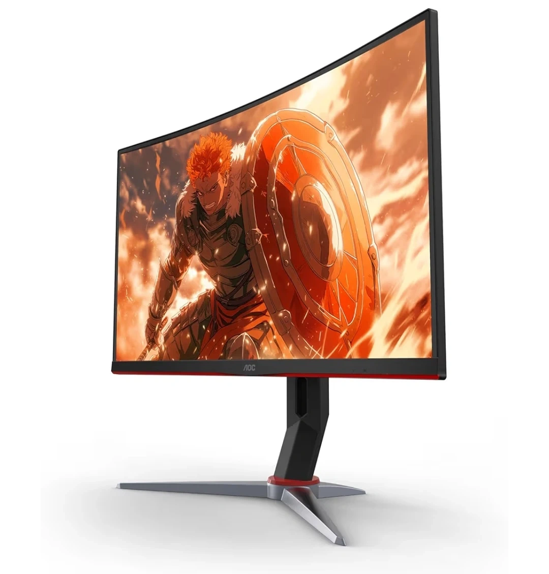 This AOC gaming monitor features a 27-inch curved display with a 1920x1080 FHD resolution and a 240Hz refresh rate. It's designed for an immersive gaming experience. The monitor has a sleek black finish with red accents.
