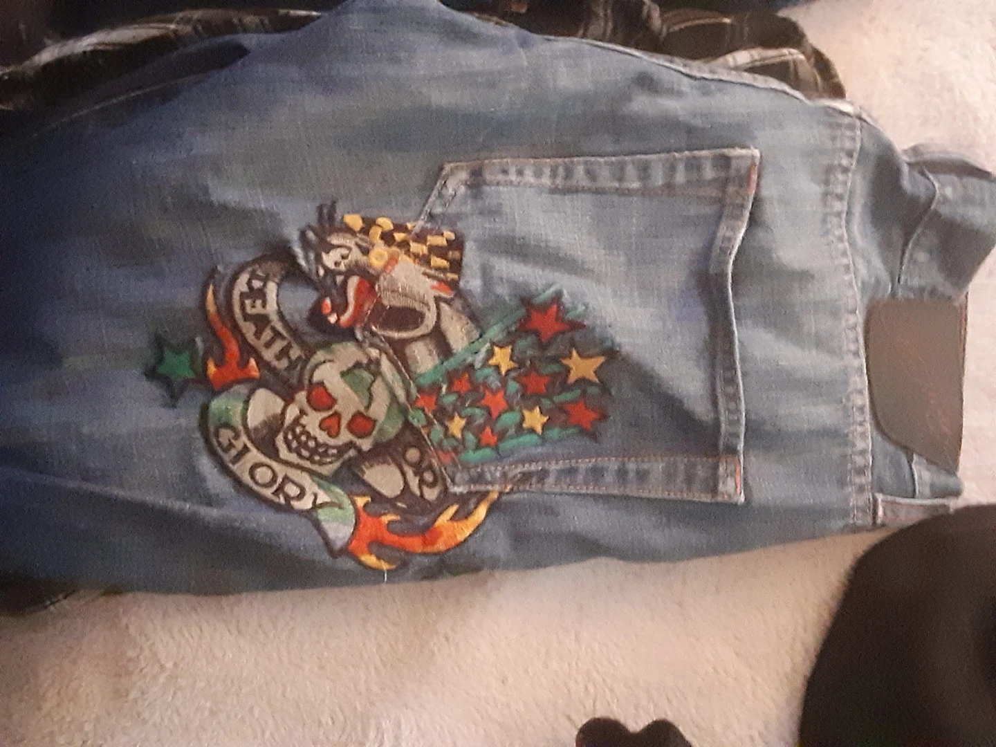 18Selling a pair of Ed Hardy jeans with unique designs on the back pockets and leg. They're in great condition and ready for a new home!