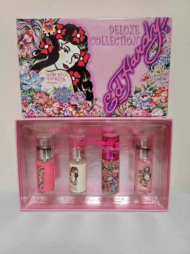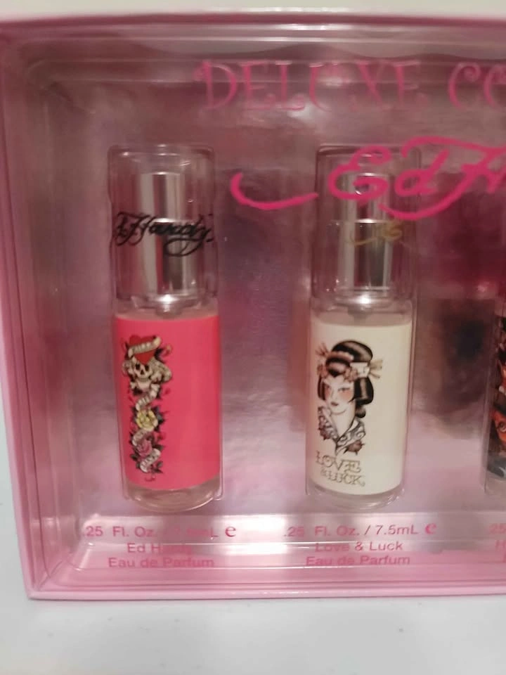 270This is new, unused. This is a fun rare set of Ed Hardy Eau de Parfum mini sprays. Each 1 is 7.5 ML. Comes in box. 1x Ed Hardy EDP 1x Love & Luck EDP 1x Hearts & Daggers EDP 1x Born Wild EDP All are sprays as pictured. Pick up in Scarborough, Kennedy & 401 Occasionally downtown Toronto, Queen & Victoria Meet at local mall if schedule permits, to quickest meetup (I actually like the scent of all of these, my favourite scents are Jo Malone English Pear & Freesia, Jo Malone Rose Blush, Versace Dylan Turquoise, Tory Burch Divine Moon, Chanel chance) to get an idea of what scents I like that you may like as well). Hearts & Daggers : Top notes are Red Apple, Blood Orange and Violet Leaf; middle notes are Mango, Apple Blossom and Jasmine; base notes are Musk, Woodsy Notes, Amber and Benzoin. Love & Luck Top notes are Blood Orange, Bergamot and Vodka; middle notes are Nectarine, Pink Pepper, Plum, Black Currant and Jasmine; base notes are Musk, Cedar, Sandalwood and Patchouli.
