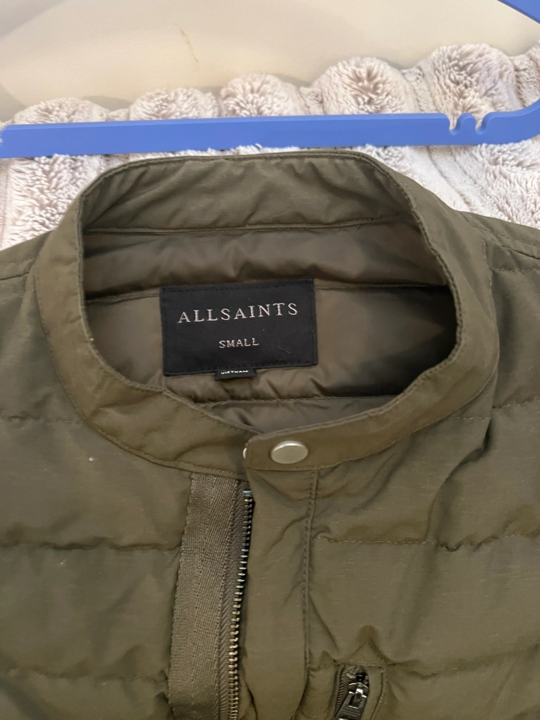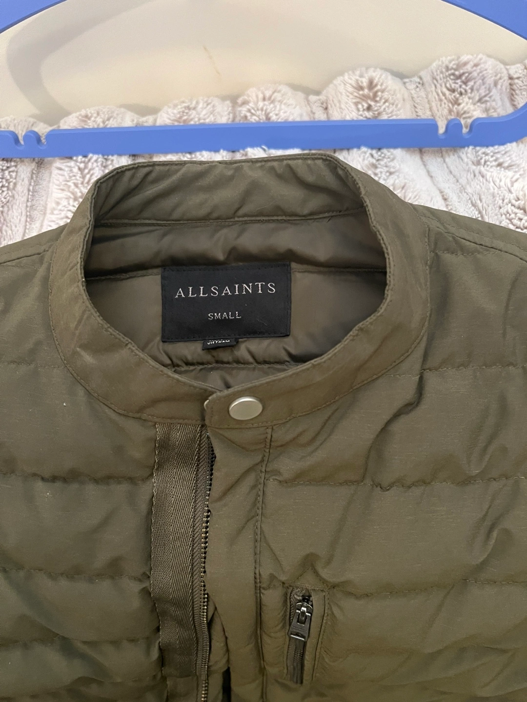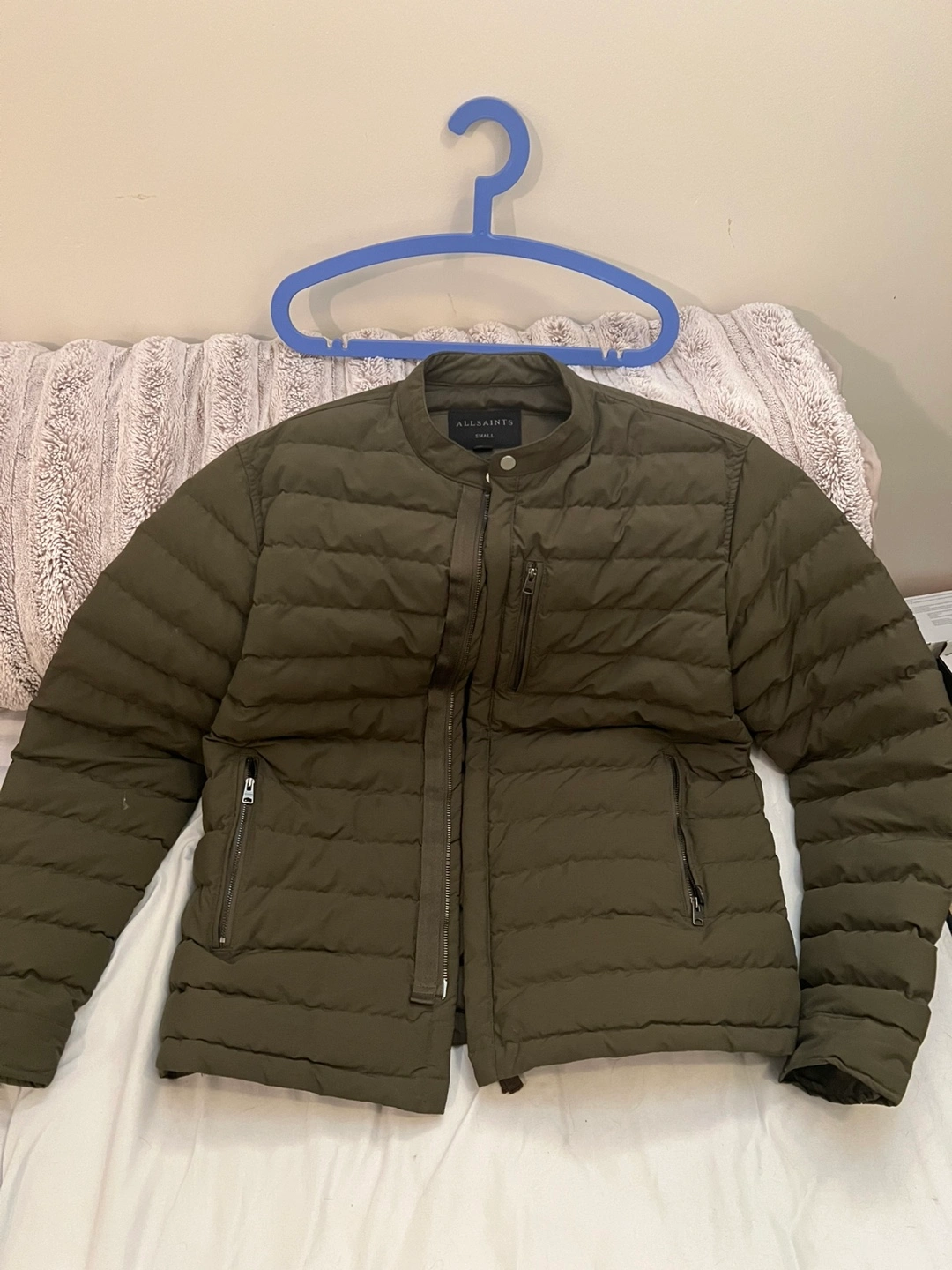 Men's olive green puffer jacket. Size small. Features a zip-up front and pockets. Lightweight and warm. Fits more like in between small/medium.