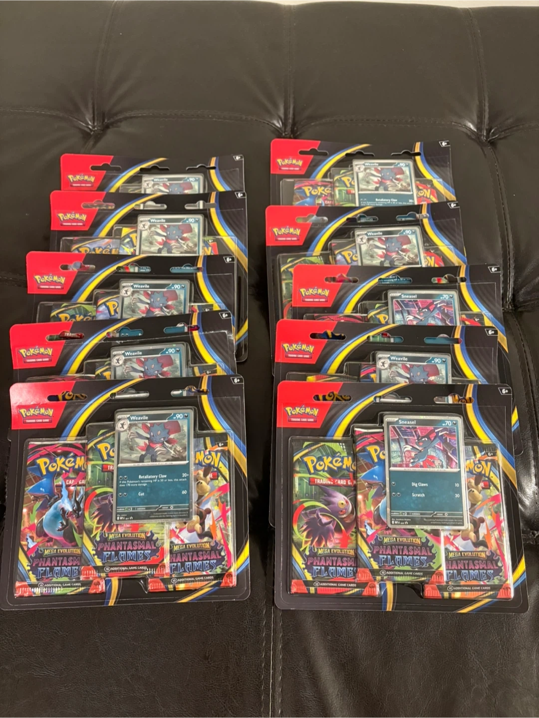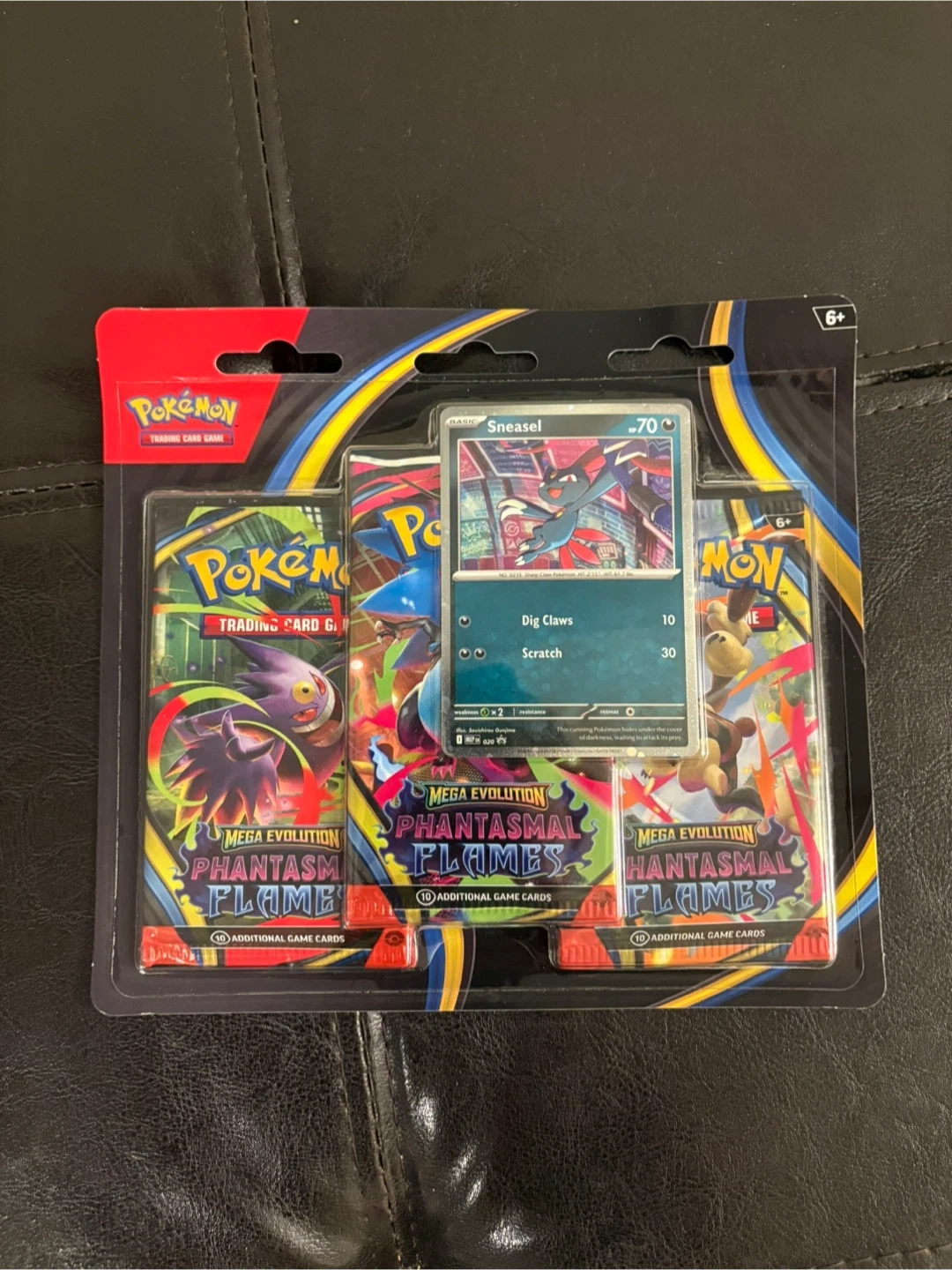 This blister pack contains three Pokémon TCG booster packs from the Mega Evolution Phantasma Flames expansion. It also includes a special Sneasel card. A fun set for collectors and players!