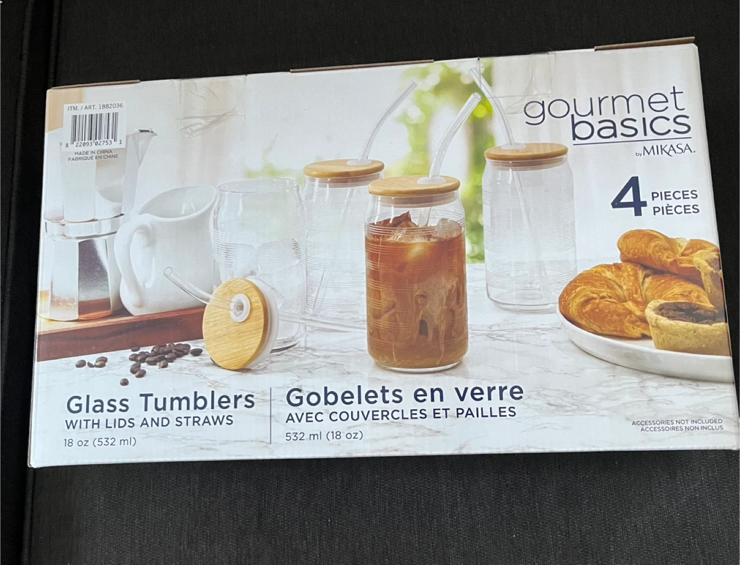 Selling a set of Gourmet Basics by Mikasa glass tumblers! This set includes four pieces, each with lids and straws. They each hold 18 oz (532 ml). Perfect for iced coffee or any cold beverage!