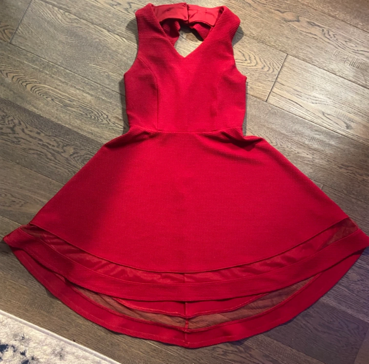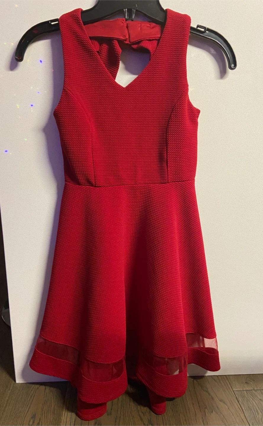 A beautiful, stylish girls red dress featuring a V-neck and a cute bow detail on the back. The dress has a textured bodice and a layered skirt with sheer accents. Longer at the back. Size 6. Like new condition and smk-free. It would be perfect for the Christmas holiday season! Pick north end St Catharines near Vine/Linwell