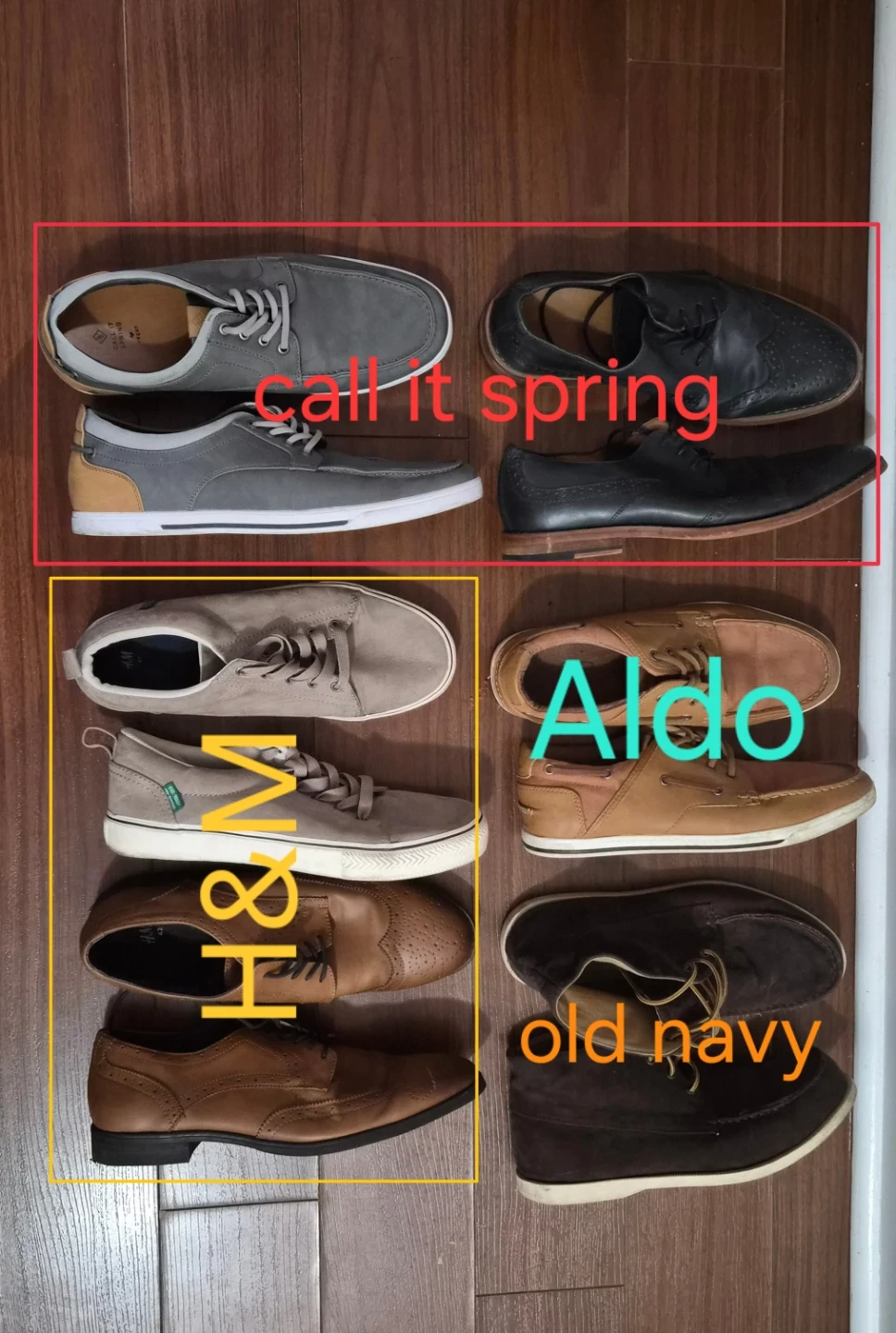 Selling a variety of men's shoes from different brands. Includes styles from Call it Spring, H&M, Aldo, and Old Navy. Great for expanding your wardrobe with diverse options!