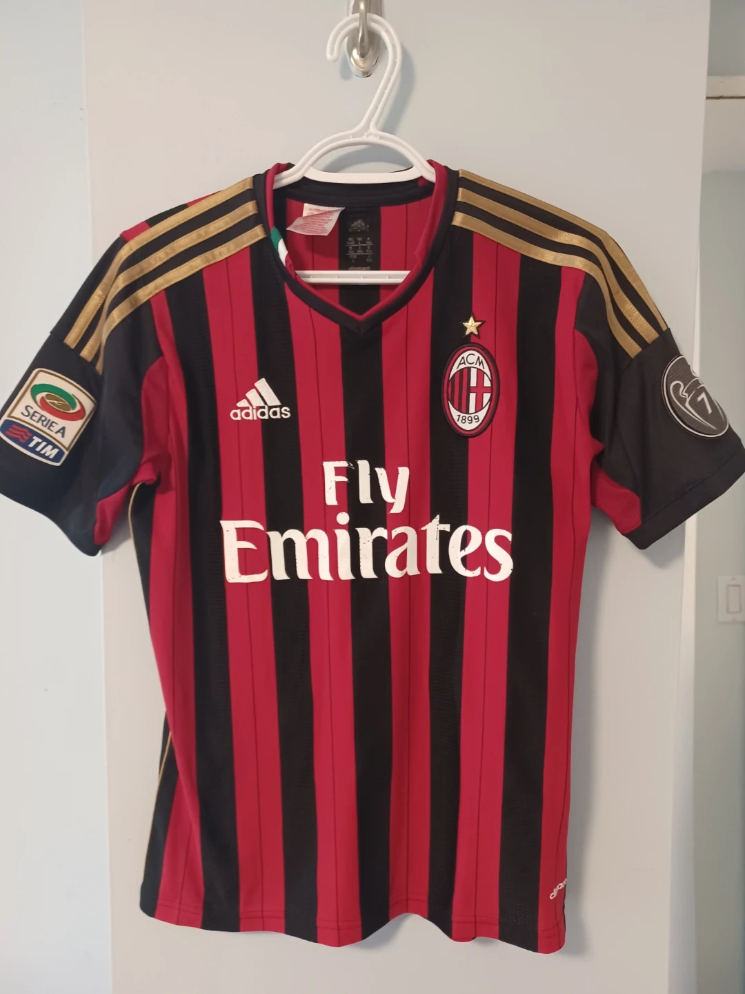 Authentic AC Milan Kit from the 2013/2014 season that I purchased back then directly from their website. Condition is good as I have worn it sparingly. Has champions league and Seria Badge. Player marking on back is faded and can be easily washed away completely if desired.