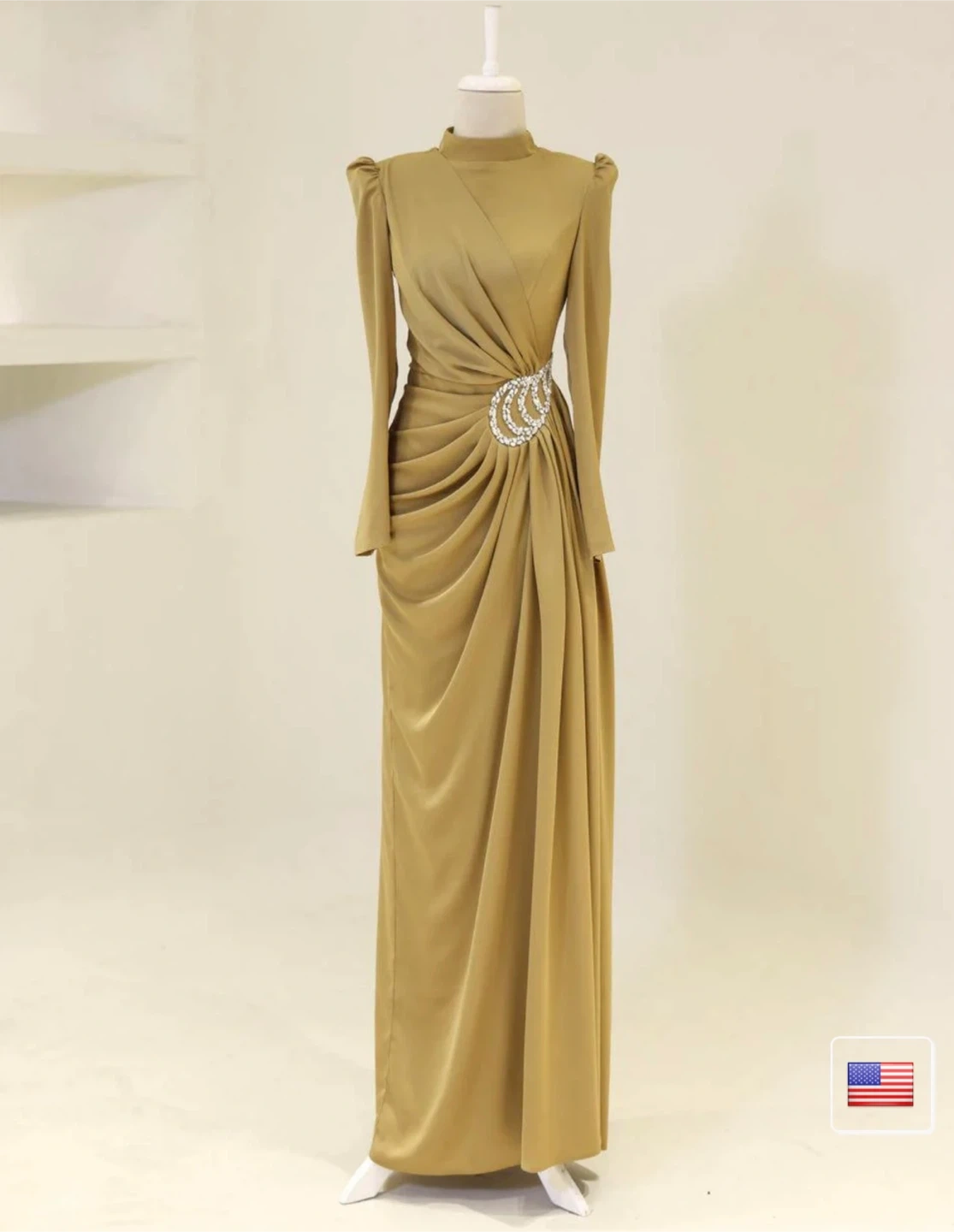 This elegant maxi dress features a sophisticated gold hue and intricate draping. It showcases a stunning jewelled embellishment on the side for a touch of glamour. The long sleeves and high neckline add to its refined silhouette.